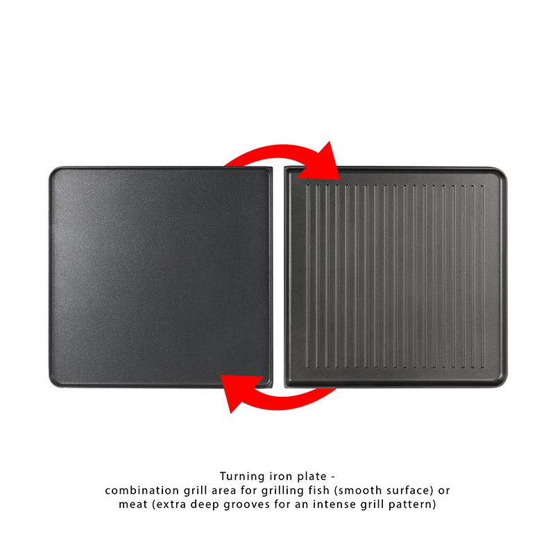 Surface de gril combinée pour griller le poisson (surface lisse) ou la viande (rainures très profondes pour un motif de gril fort)