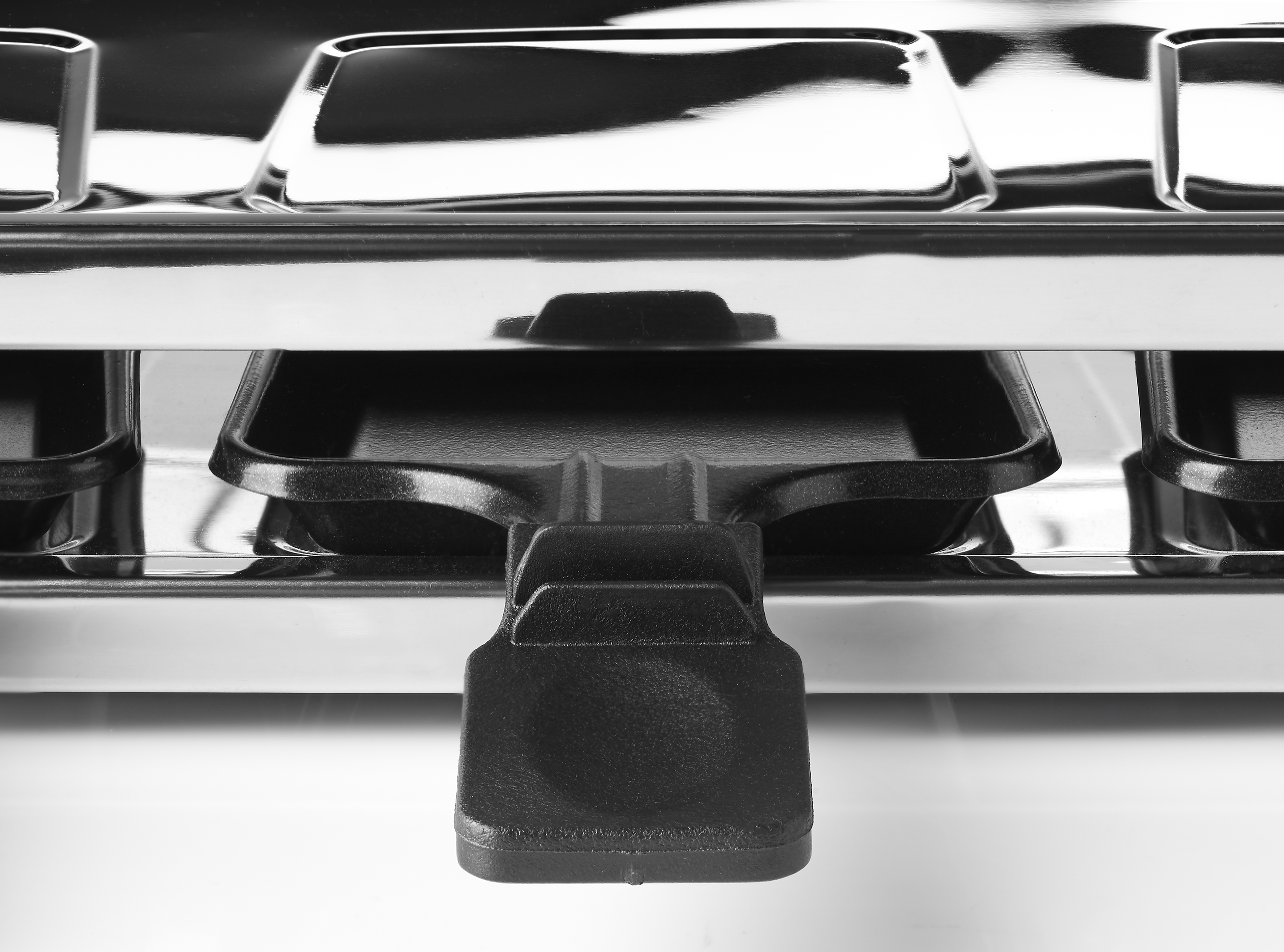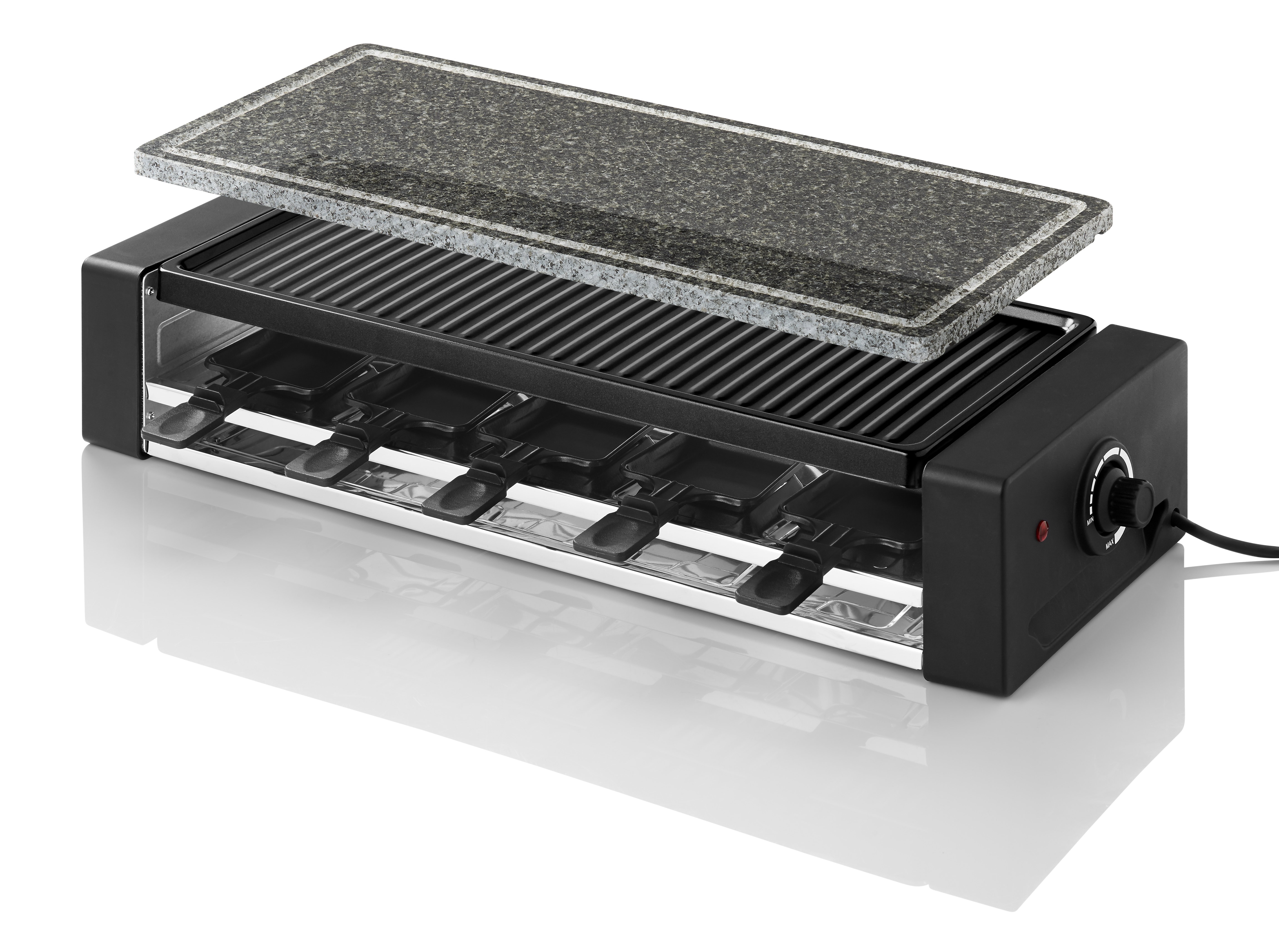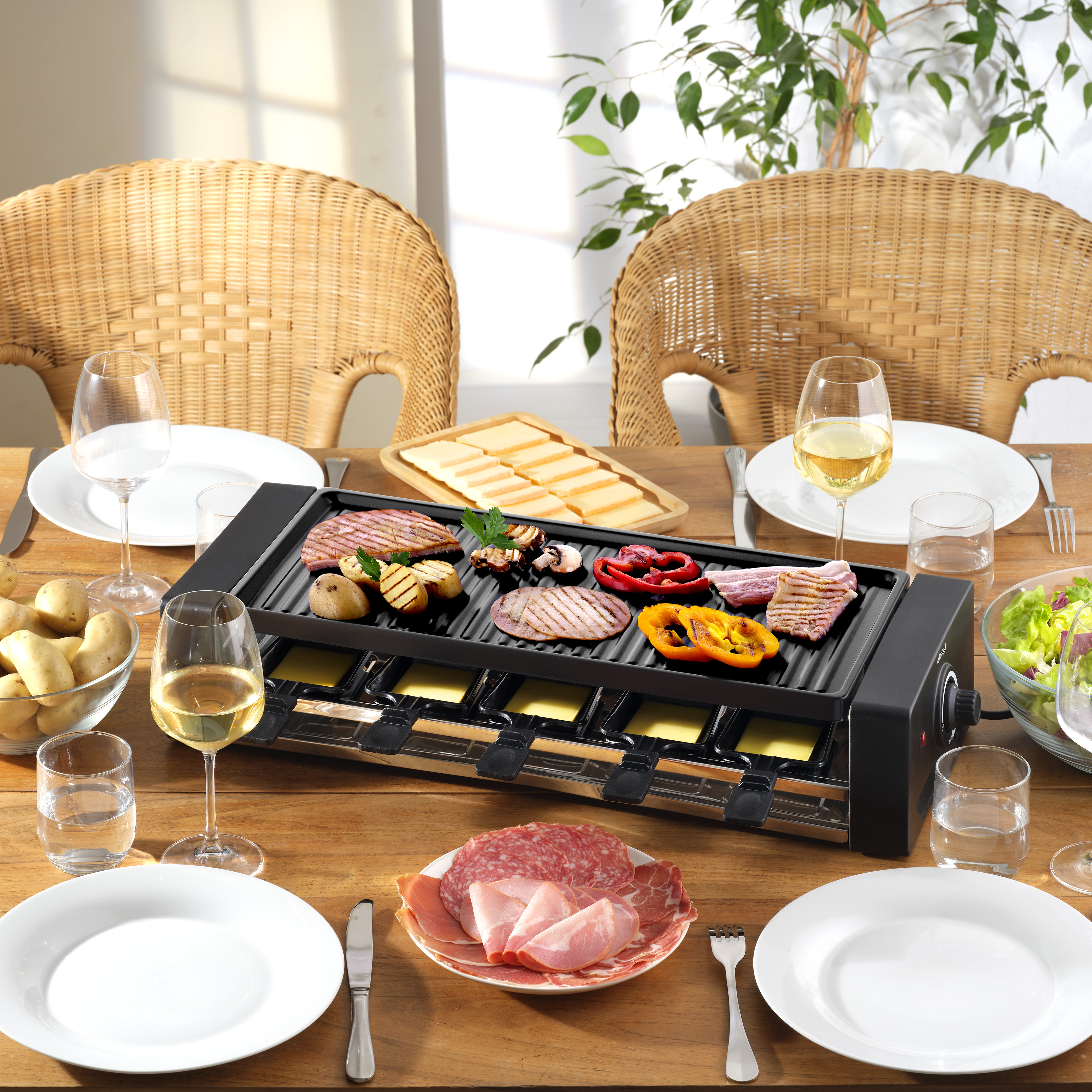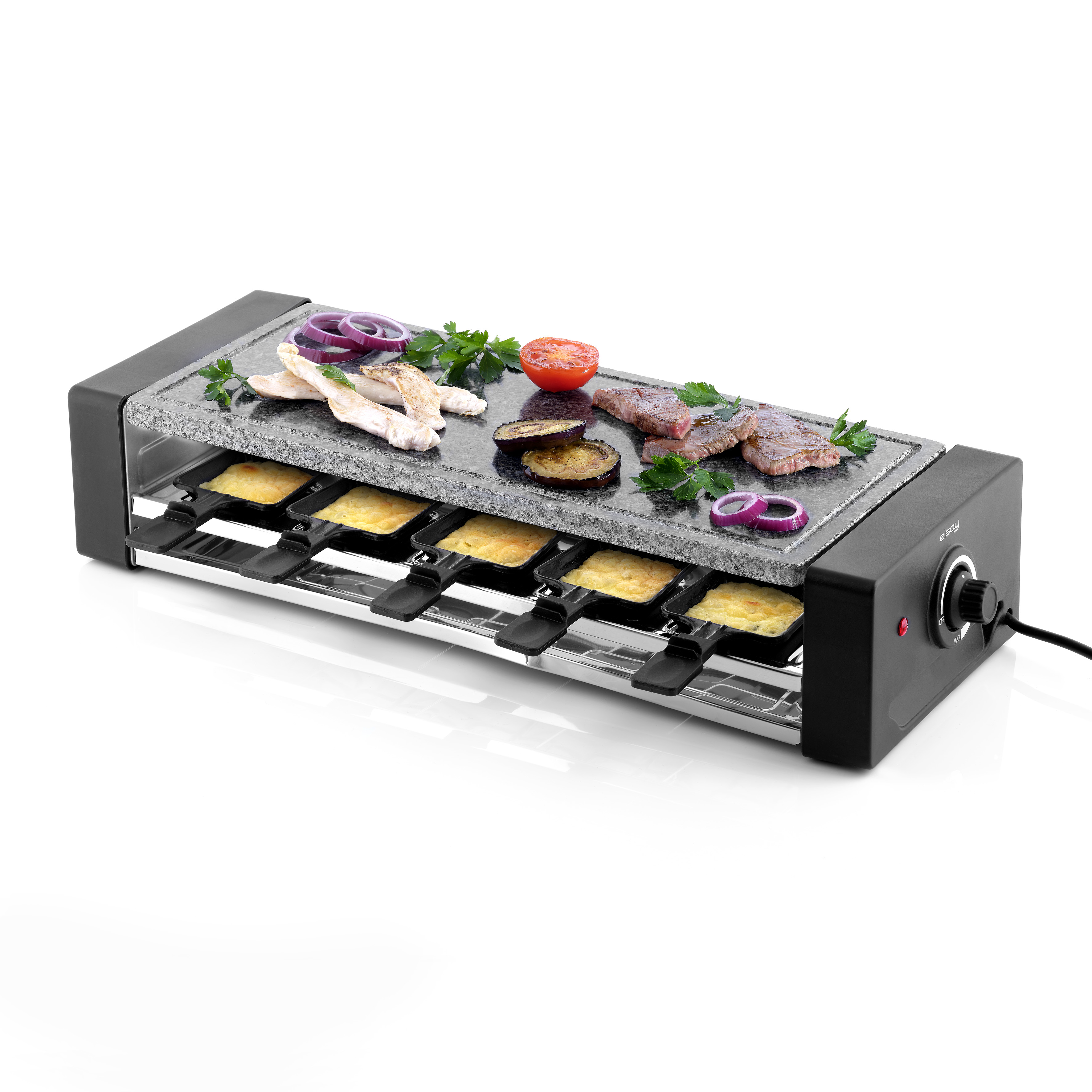 Raclette 10 personnes - Puissance 1500 W - Pierre à cuire + Plaque grill - Revêtement anti-adhérent - 52x23 cm - Plaques amovibles - 10 poêlons - Repose-poêlons - Coloris noir