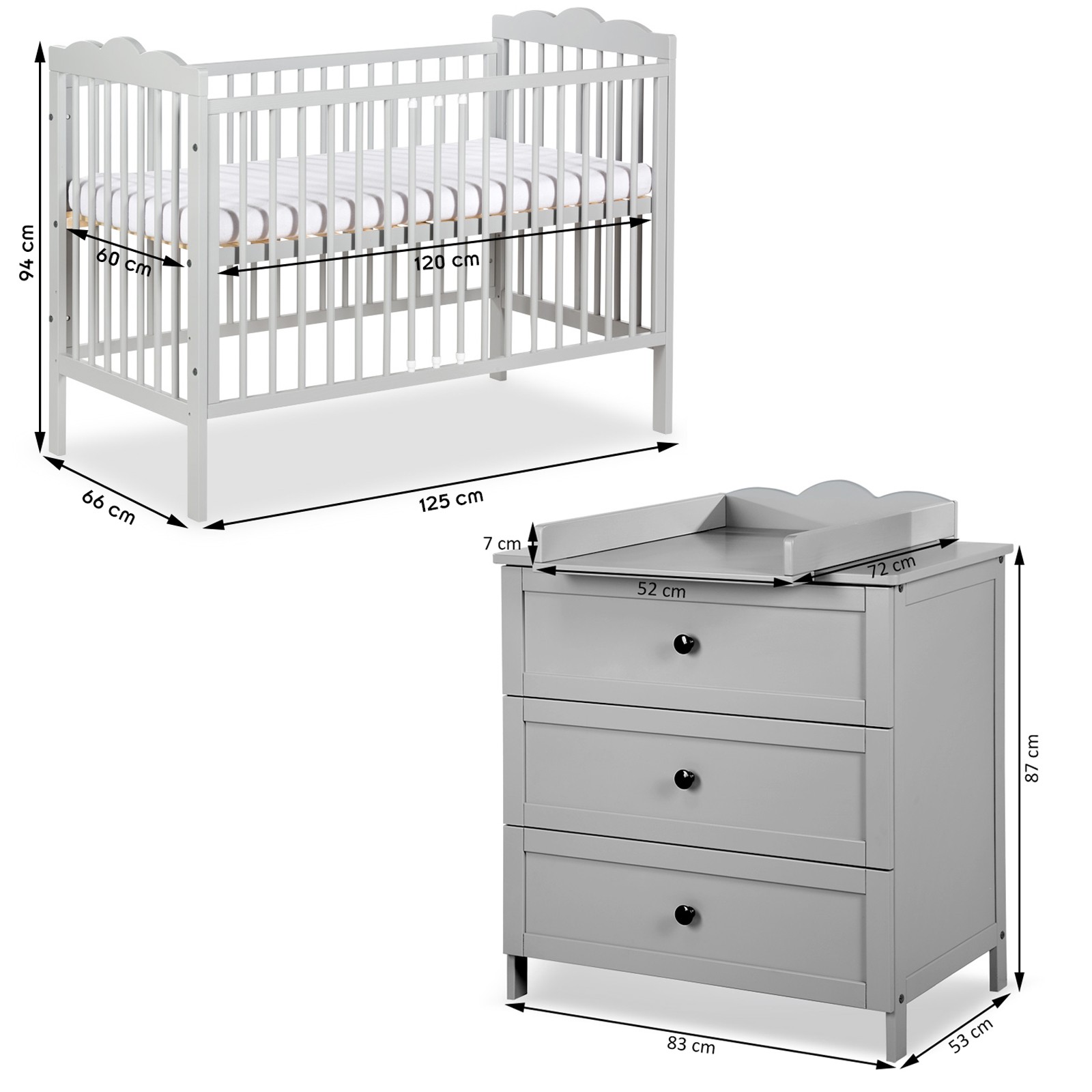 | Libellé | RADEK III Chambre bébé commode à langer et lit en bois Gris 120x60 cm |