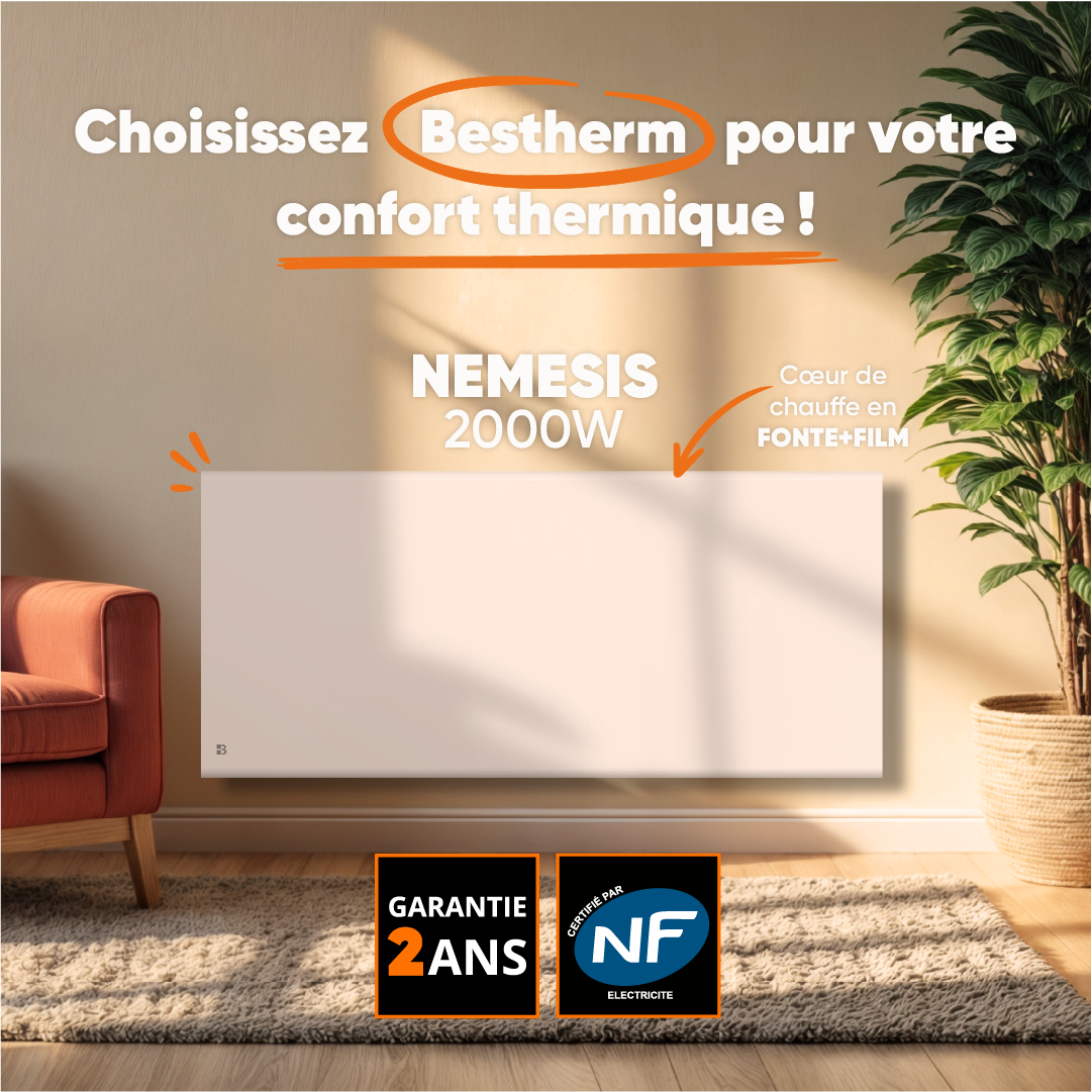 Plus produit Programmation personnalisée et détection d'ouverture des fenêtres : jusqu'à 30 % d'économies sur votre facture de chauffage. Grâce à la fonte et au film chauffant, la chaleur est à la fois rapidement diffusée et durablement maintenue. Cela assure une température homogène, stable et économe. Facile à utiliser au quotidien, NEMESIS est doté d'une interface intuitive et claire. Certifié NF et garanti 2 ans, NEMESIS allie performance, fiabilité et sérénité. Sécurité enfant intégrée.