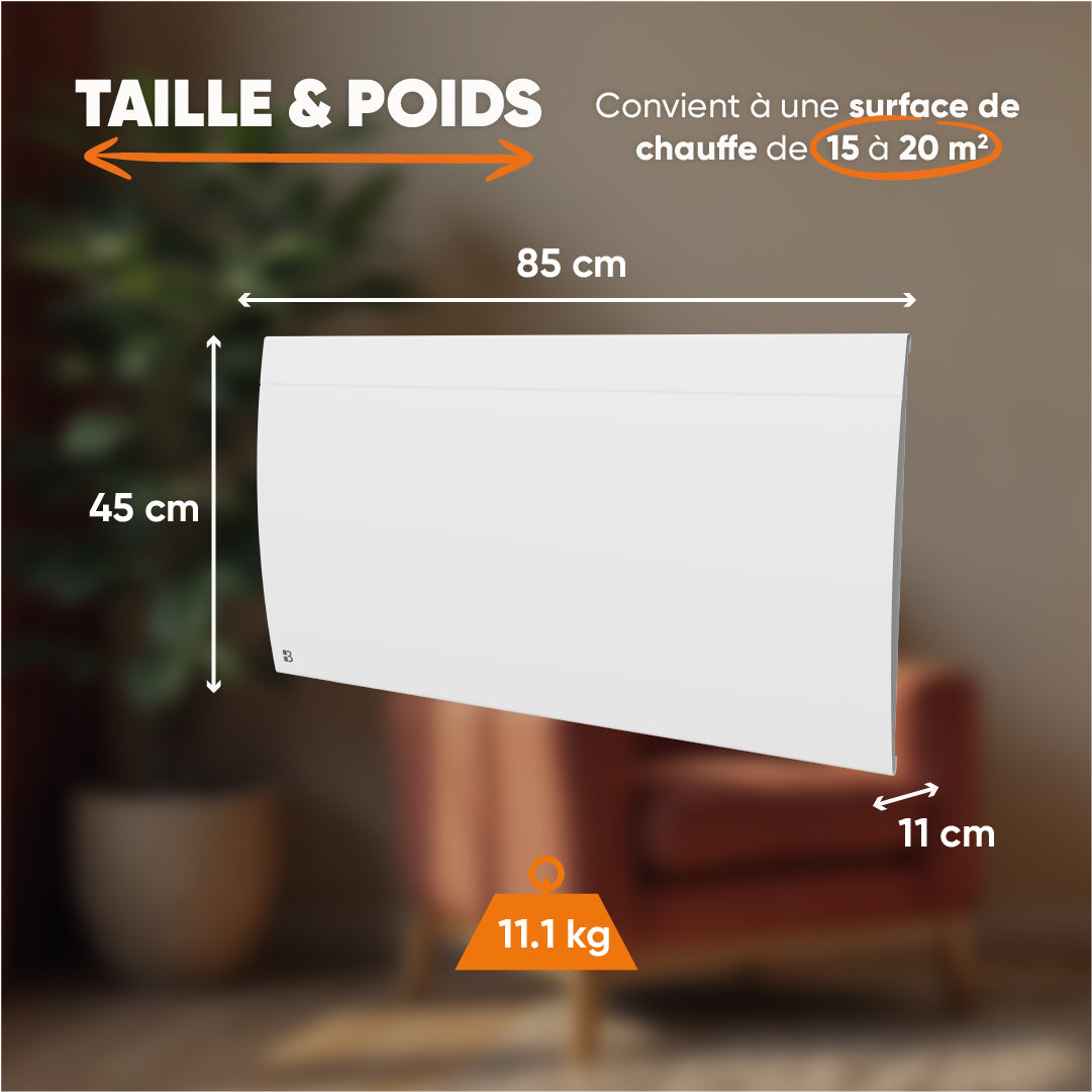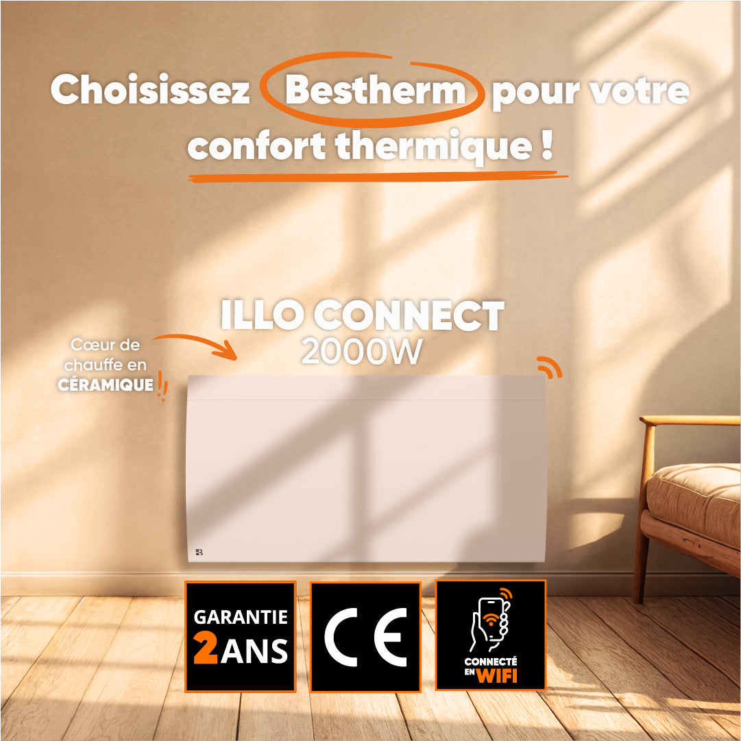 Libellé Radiateur électrique fixe connecté WIFI à inertie sèche céramique 2000W Bestherm ILLO CONNECT horizontal blanc