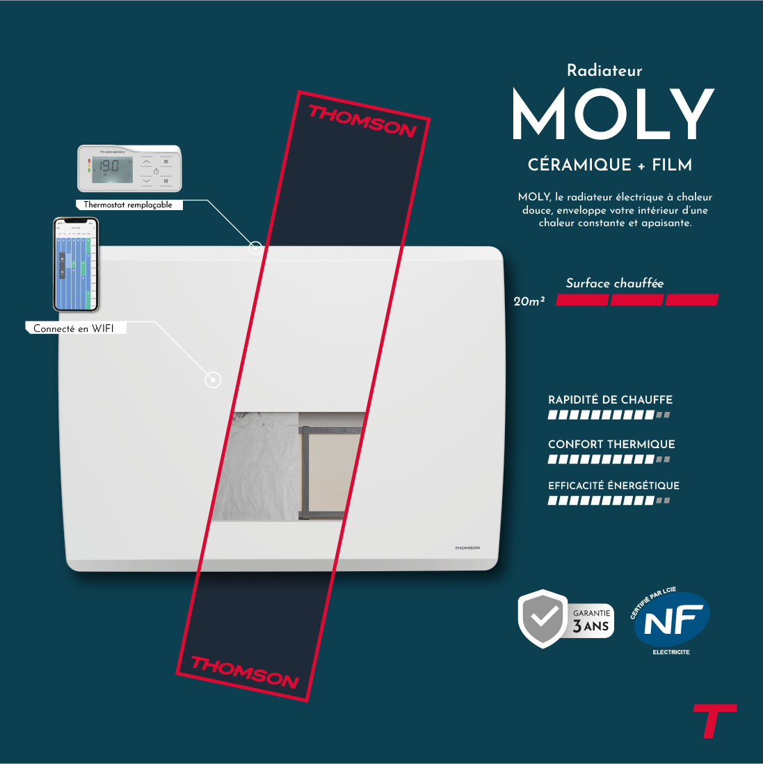 MOLY 2000W : Radiateur électrique connecté WiFi double cœur de chauffe céramique + film avec thermostat interchangeable – THOMSON