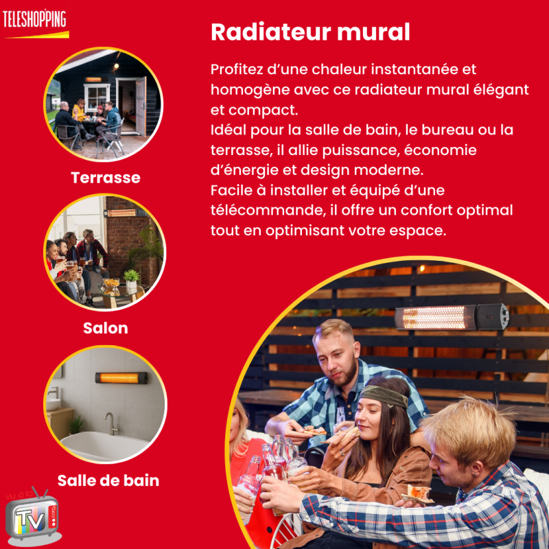 Pratique et facile à contrôler – Équipé d'une télécommande, il permet d'ajuster la température et la durée de chauffe sans se déplacer. Son format mural compact économise de l'espace tout en offrant un chauffage efficace sur une large zone.