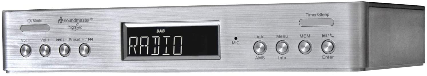 Le Soundmaster UR2045SI est une petite radio de cuisine polyvalente qui peut être montée sous une unité murale dans la cuisine, par exemple. La façade en aluminium brossé donne à la radio un aspect intemporel. La radio de cuisine est équipée de Bluetooth et permet la diffusion de musique en continu depuis un smartphone ou une tablette. Avec cet appareil, vous avez également la possibilité de profiter de la musique de manière flexible et presque illimitée dans votre cuisine. Grâce à la fonction Bluetooth, vous pouvez également utiliser l‘UR2045SI en mains libres . C‘est particulièrement pratique si vous voulez téléphoner pendant que vous cuisinez, par exemple, et avoir les mains libres en même temps. Avec la radio de cuisine Soundmaster, vous pouvez recevoir à la fois la radio DAB/DAB+ et UKW, vous avez donc un large choix de stations radio et une méthode de réception flexible. La mémoire fixe avec mémorisation automatique des stations vous permet de retrouver et de profiter de vos stations préférées en toute simplicité. Grâce à la technologie d‘horloge radiocommandée, la date et l‘heure se règlent précisément et le passage à l‘heure d‘été ou d‘hiver fonctionne également de la même manière.Avec deux heures de réveil/alarme et un Timer (minuterie d‘uf), la radio sert de réveil et d‘aide utile dans la cuisine. A votre demande, la radio s‘éteint d‘elle-même après un certain temps grâce à la fonction veille.La bande lumineuse LED fixée sur la face inférieure de l‘appareil est un des points forts de l‘appareil, ce qui en fait l‘éclairage idéal pour la cuisine, directement intégré dans la radio. Grâce à ses fonctions pratiques et polyvalentes, l‘appareil simplifie votre vie quotidienne et constitue un complément utile, en particulier dans la cuisine.