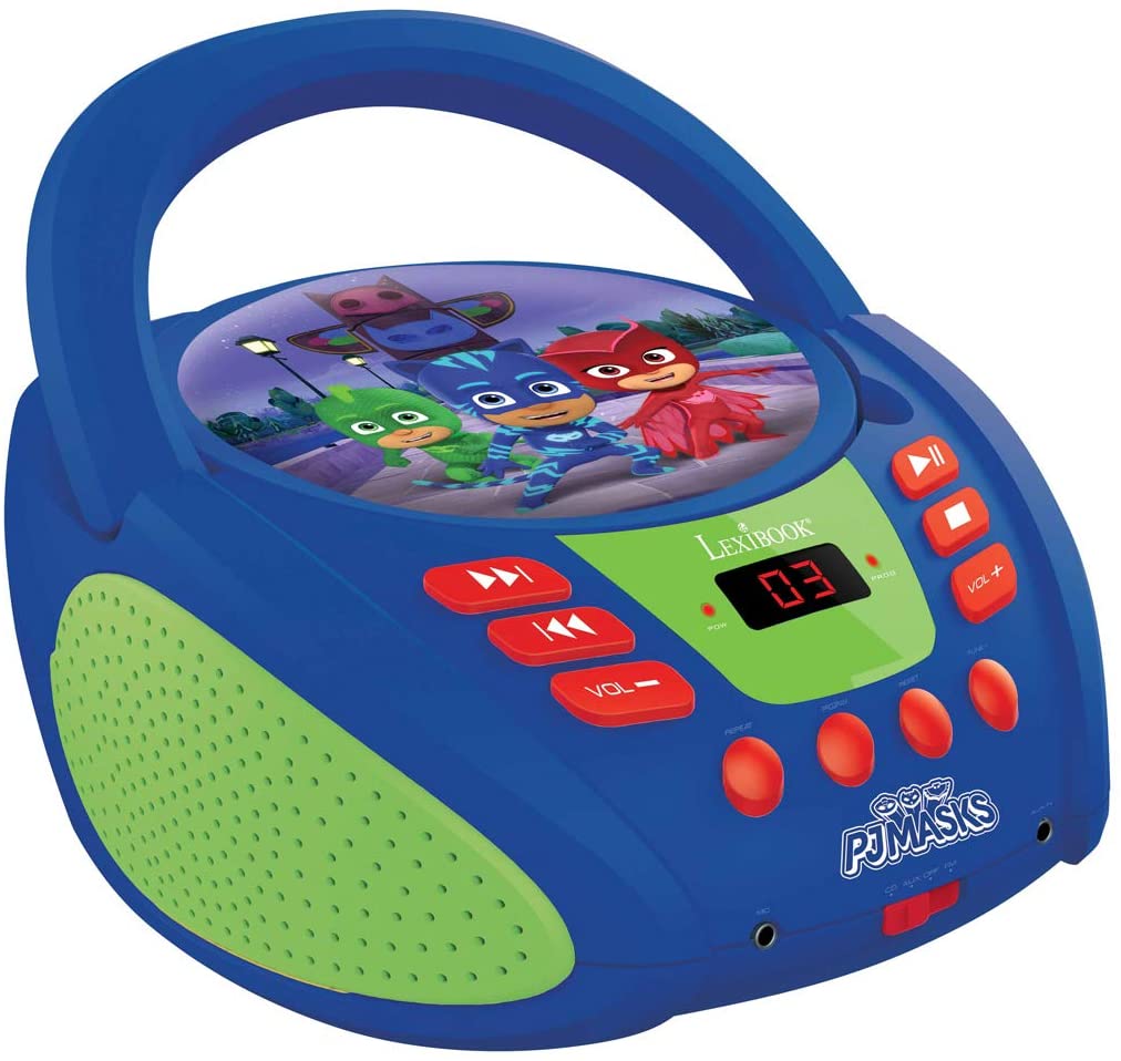 Ce lecteur CD multifonctions aux couleurs des Pyjamasques va faire des heureux ! Équipé de gros boutons et d’un large écran LCD, les enfants n’auront pas de mal à manipuler l’appareil et lire les numéros des pistes affichées à l’écran. En plus, sa poignée intégrée rend le transport pratique et votre enfant pourra l’emporter partout !Profitez du mode répétition du lecteur radio CD pour réécouter un seul morceau ou toutes les pistes du CD en boucle, parce que quand on aime, on ne compte pas !Vous pouvez aussi personnaliser l’écoute et programmer une séquence, jusqu’à 20 titres, à partir du CD ! Alors, en avant la musique !Grâce à la diversité de ses options, variez les plaisirs et écoutez la musique à partir d’un CD, de la radio FM ou sélectionnez les pistes à partir de votre lecteur audio et smartphone, grâce à la prise auxiliaire (câble auxiliaire non inclus) ! Faites profiter la musique à tout le monde avec ses enceintes 0.8 watts et chantez sur vos chansons préférées grâce à la prise micro intégrée sur l’avant (micro non inclus)