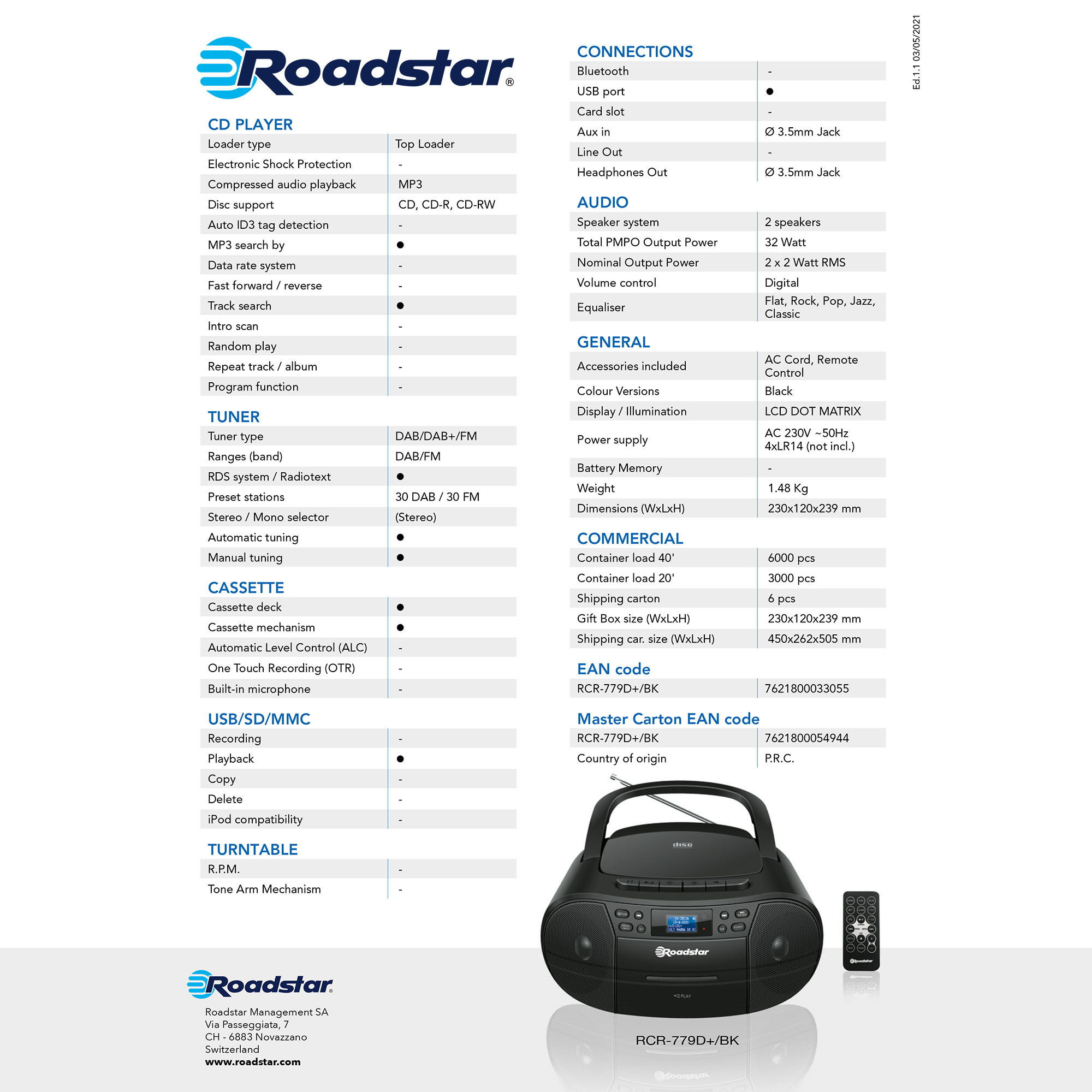 | Libellé | Radio Portable DAB / DAB+ / FM, Lecteur CD-MP3, Cassette, USB, Télécommande Noir RoadstarRCR-779D+/BK |