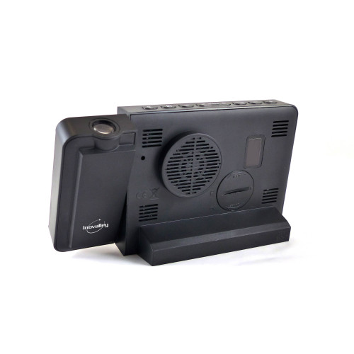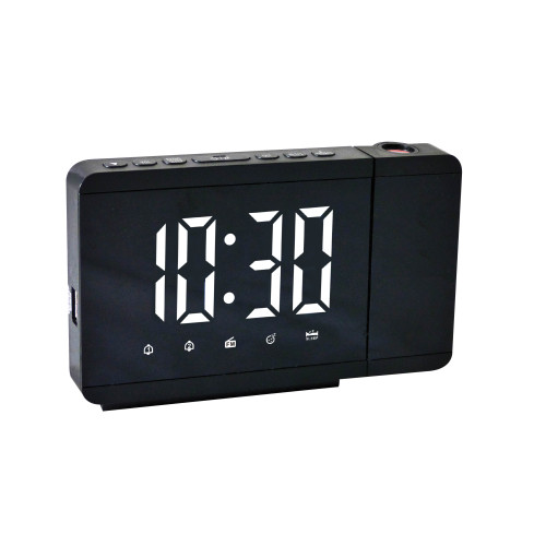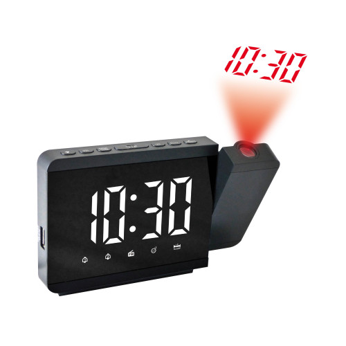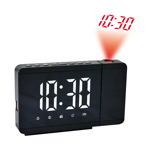Le radio réveil projecteur design pour des journées rythmées. Ce réveil complet indique l'heure en grand et en bien visible (Blanc sur fond noir)