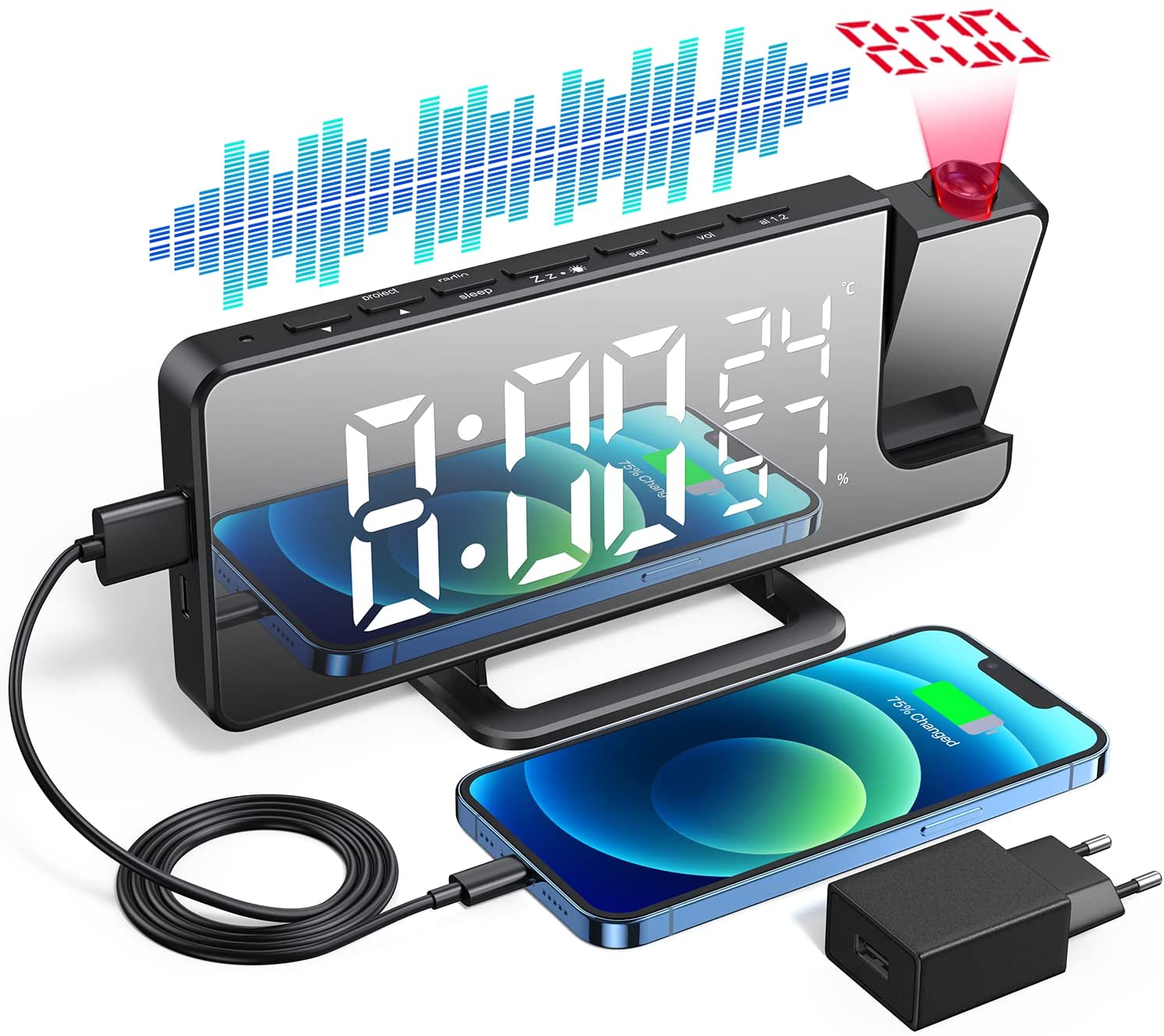 La colonne de projection avant et arrière rotative à 90 °, la lampe de projection rotative à 180 °, la luminosité réglable à 6 niveaux et la fonction photosensible automatique, créent facilement un environnement nocturne satisfaisant pour vous.Le réveil à projection Lemnoi peut être utilisé comme radio pour vous accompagner à dormir pendant la longue nuit. La radio peut mémoriser 10 stations de radio et la durée de lecture peut être réglée.Vous pouvez régler deux réveils différents pour répondre à vos besoins dans des plages horaires différentes. Lorsque l'alarme sonne, une touche pour entrer dans le mode snooze, vous pouvez régler l'heure de 5 à 60 minutes.L'écran LED est très clair et peut être utilisé comme un miroir. Le réveil à projection Lemnoi peut afficher simultanément l'heure, la température et l'humidité en grosses lettres, ce qui convient aux personnes âgées.Lorsque le réveil de projection est connecté à l'alimentation avec le cordon d'alimentation TYPE-C, il peut charger d'autres appareils électroniques via la sortie USB. L'adaptateur conforme à l'UE est inclus dans la boîte, vous n'avez donc pas besoin de l'acheter séparément.