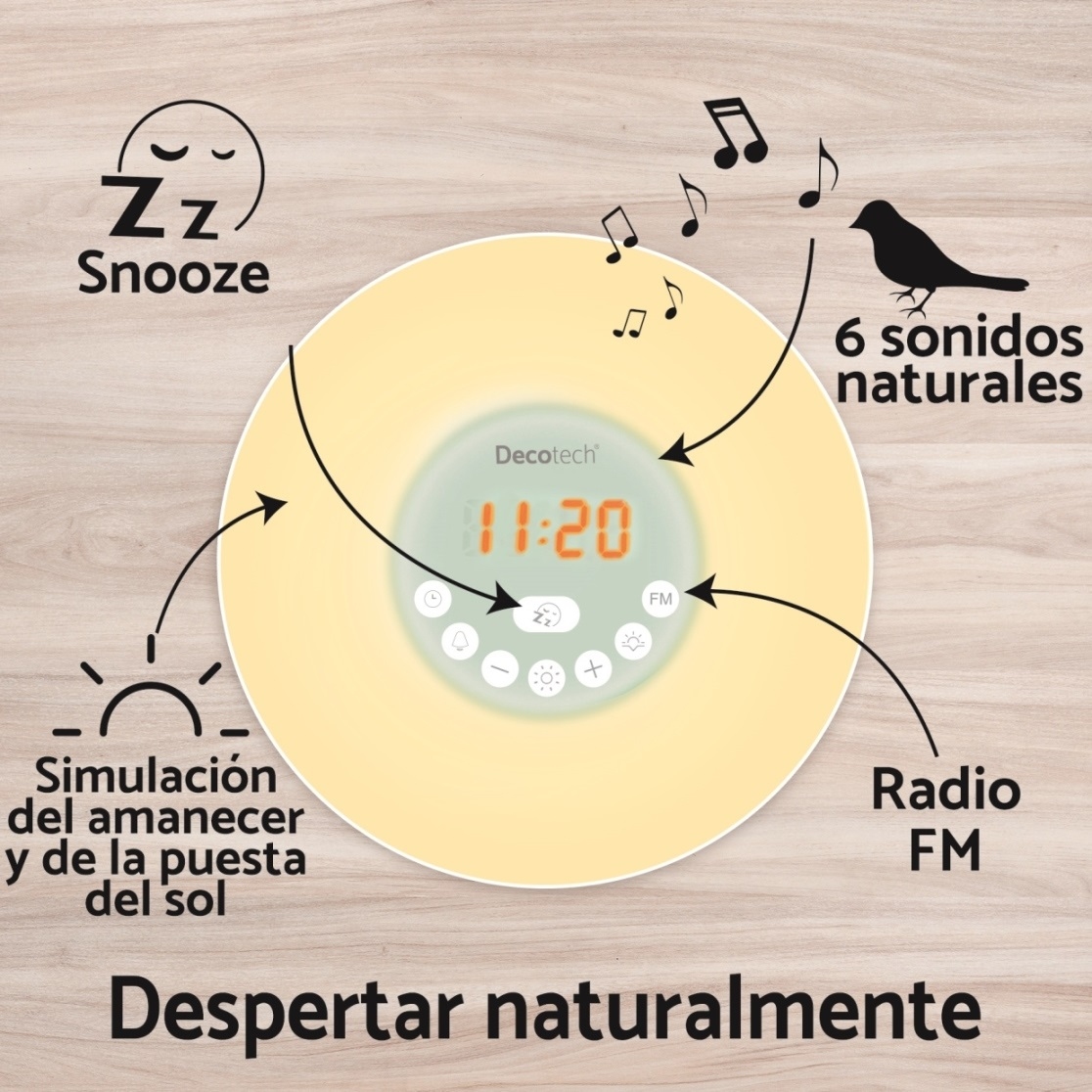 * Réveillez-vous en douceur avec la simulation de lever du soleil qui commence 30 minutes avant l’heure de réveil. * Possibilité de simuler le coucher de soleil avec une luminosité qui s'estompe progressivement à partir de 30 minutes avant votre heure de coucher. * Fonction lampe de chevet, avec lumière neutre ou 7 modes de couleur (multicolore, vert citron, rouge grenadine, bleu céleste, mauve, orange mandarine, bleu turquoise). * Alarme avec 6 sons de la nature et volume ajustable 15 niveaux. * Fonction snooze 5 minutes. * Radio FM avec mémorisation et scan des stations de radio. * Alimentation : adaptateur secteur (inclus) + 2 piles AAA (non incluses) pour la sauvegarde des paramètres en cas de rupture de courant. * Dimensions : 14,7 x 17 x 10,5 cm.