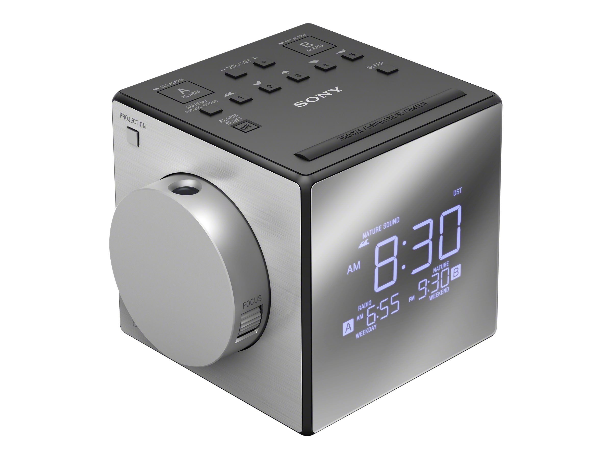 Projection de l'heure. Tuner FM. Double alarme. L'alarme fonctionne même sans alimentation. Port USB. Garantie 2 ans pièces et main-d'oeuvre.