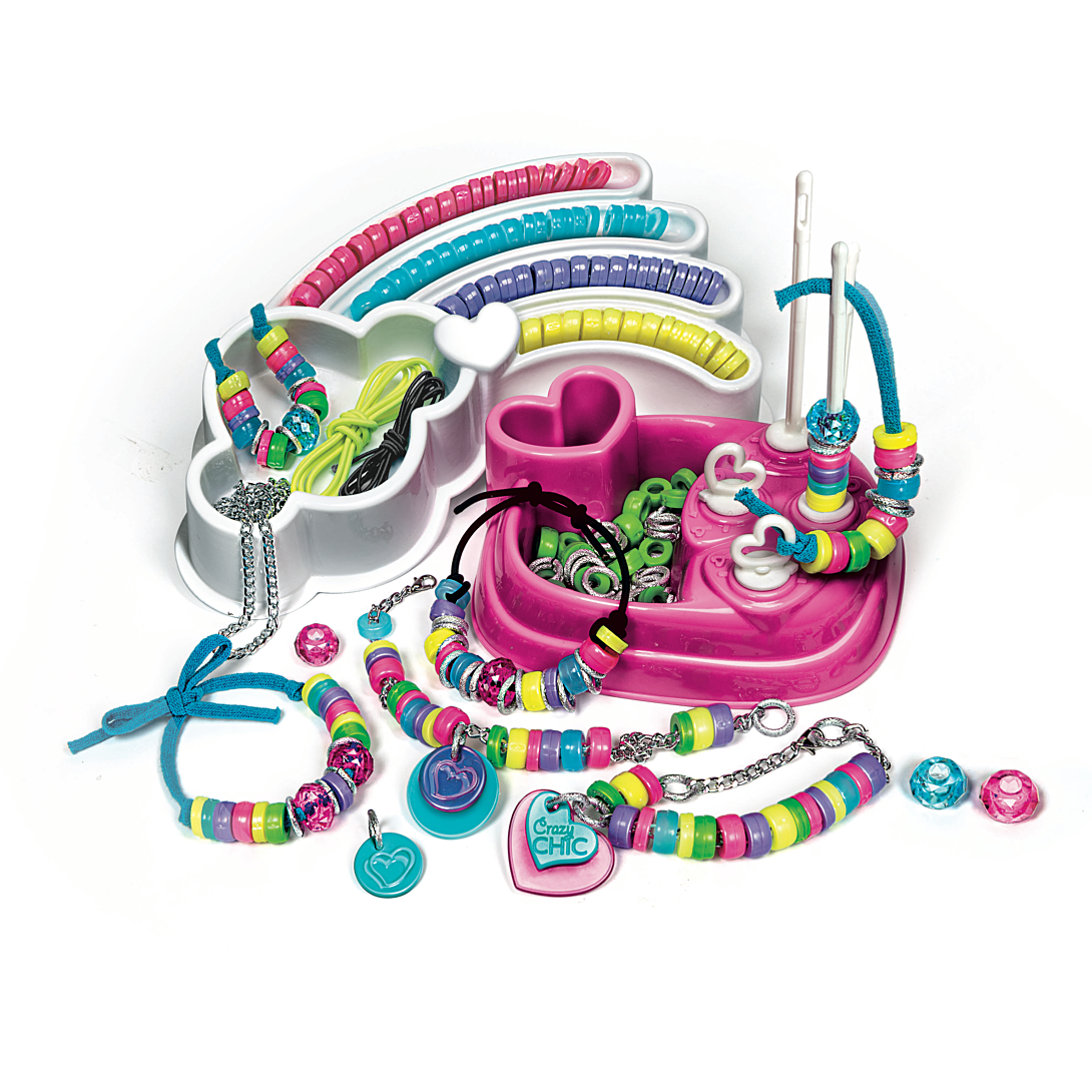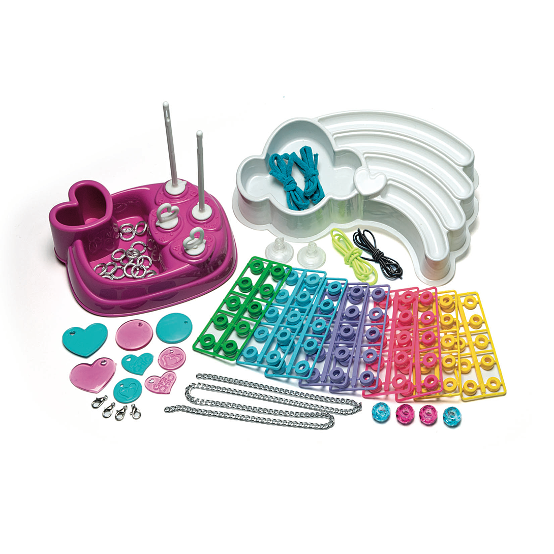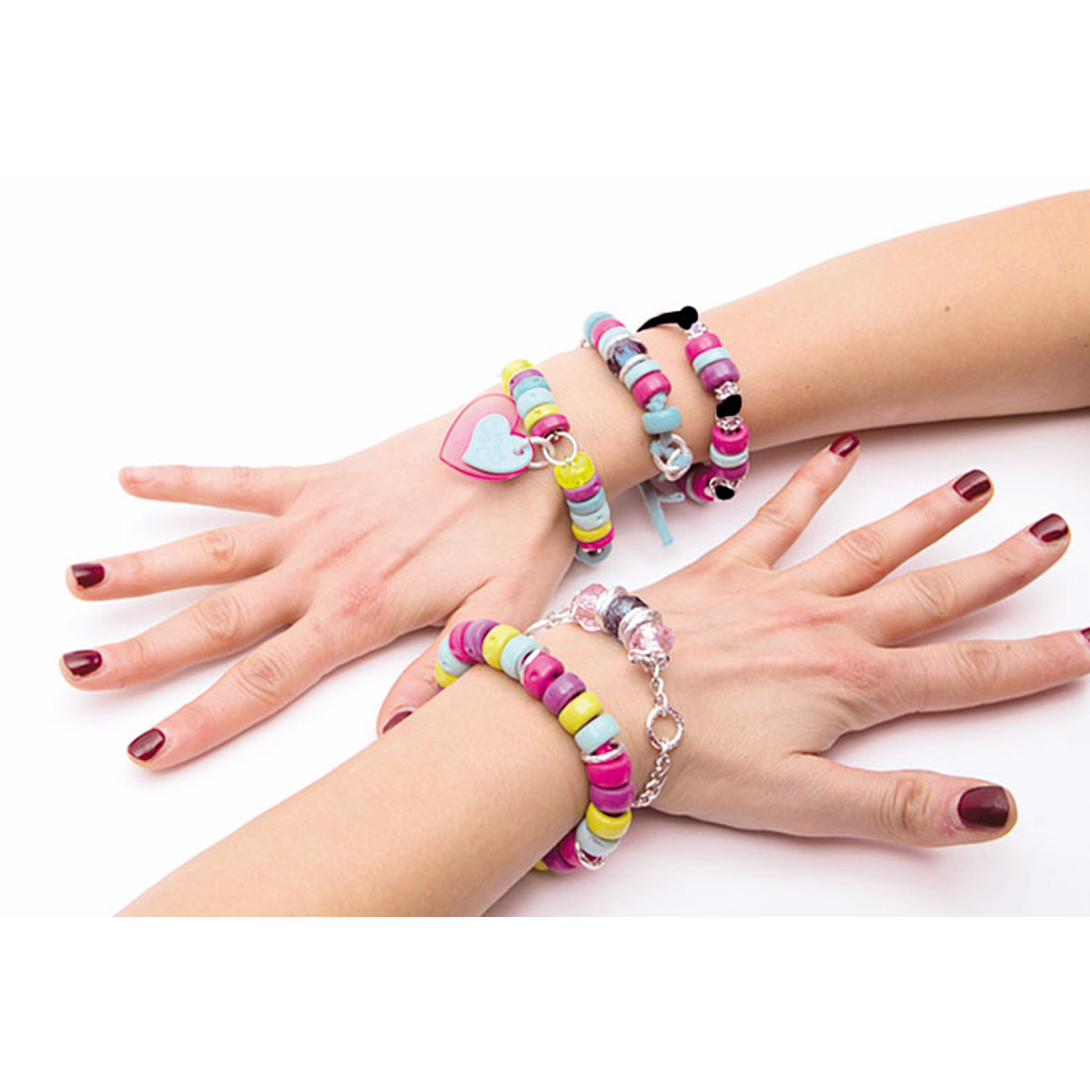 • Un fantastique coffret créatif pour créer des bracelets multicolores et être toujours à la mode. • Adapte les chaînes ou les bracelets à ta tenue et ton style sera parfait en toute occasion ! • Le coffret contient 100 perles colorées, des fermoirs métalliques, des bracelets en lycra et des chaînes à assembler pour former des bijoux glamour. • Les accessoires inclus te permettront de faire facilement les bijoux et de ranger tes perles. • Suis le manuel illustré pour tes premières créations et laisse ensuite libre cours à ton imagination.