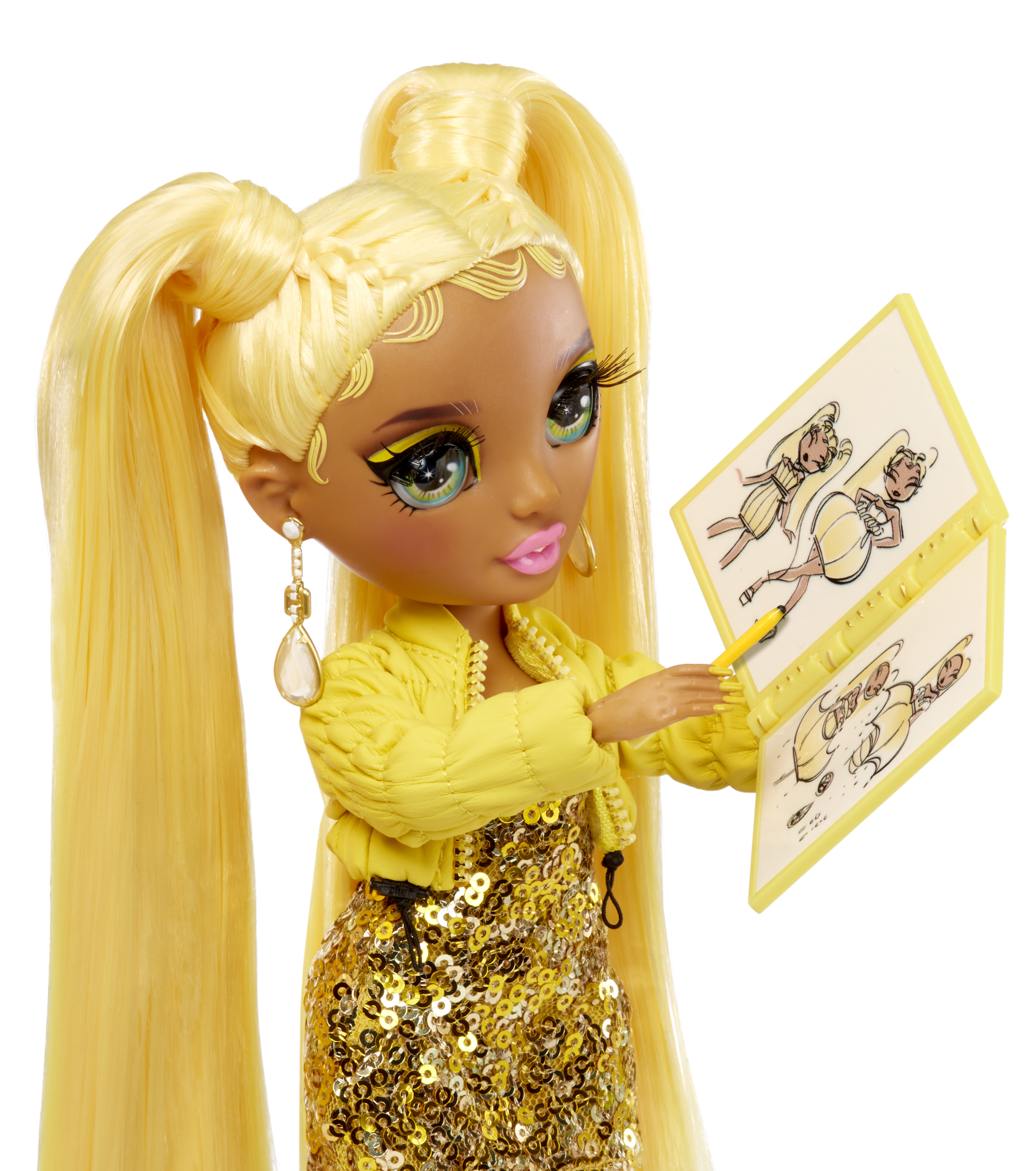 Enfin, vous pouvez obtenir les magnifiques tenues de nos personnages Rainbow High préférés / originaux conçus pour leur classe de piste. Ruby, Poppy, Sunny, Jade, Skyler, Violet et Amaya ont chacune laissé briller leurs vraies couleurs lorsqu'elles ont créé chacune de ces pièces phares. regards. Vous vous amuserez à recréer l'épisode avec ces looks ainsi que la 2ème tenue plus décontractée, plein d'accessoires, et même un carnet de croquis ! Collectez les tous!
