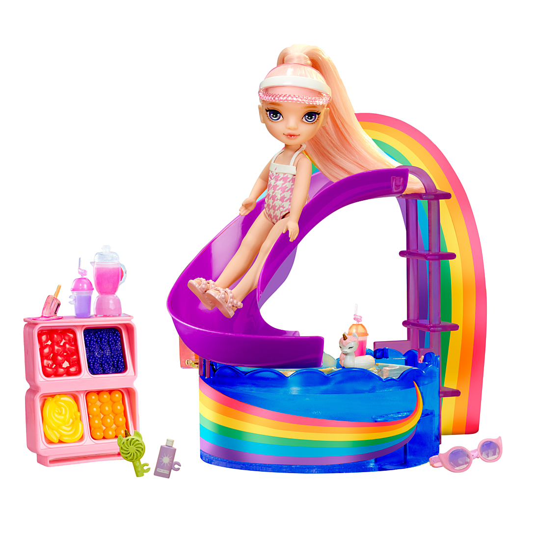 Prépare-toi à passer une journée innoubliable à la piscine avec Blush. Stand de smoothies, piscine avec toboggan, nombreux accessoires inclus. Poupée de 15 cm. Dès 6 ans.