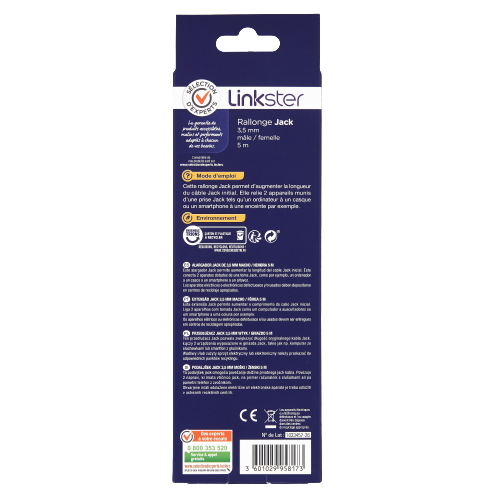 | Libellé | Rallonge jack 3,5mm mâle/femelle - 5m - Sélection d’Experts - Linkster |