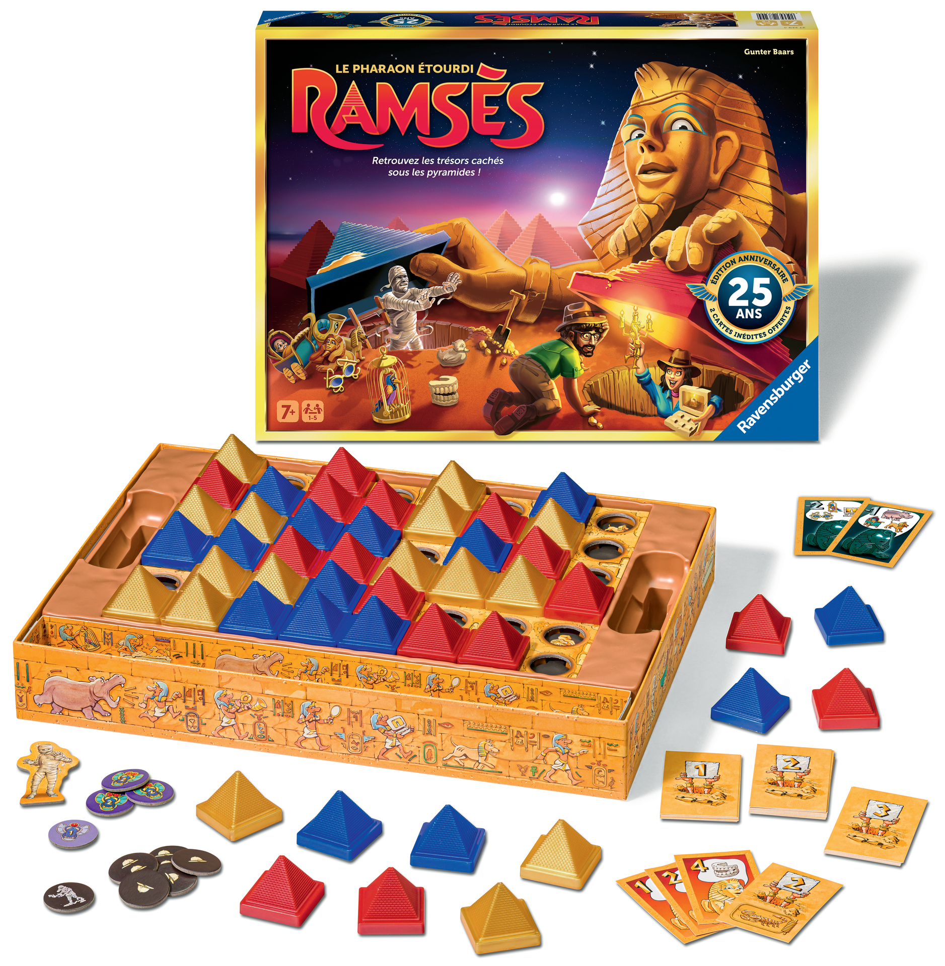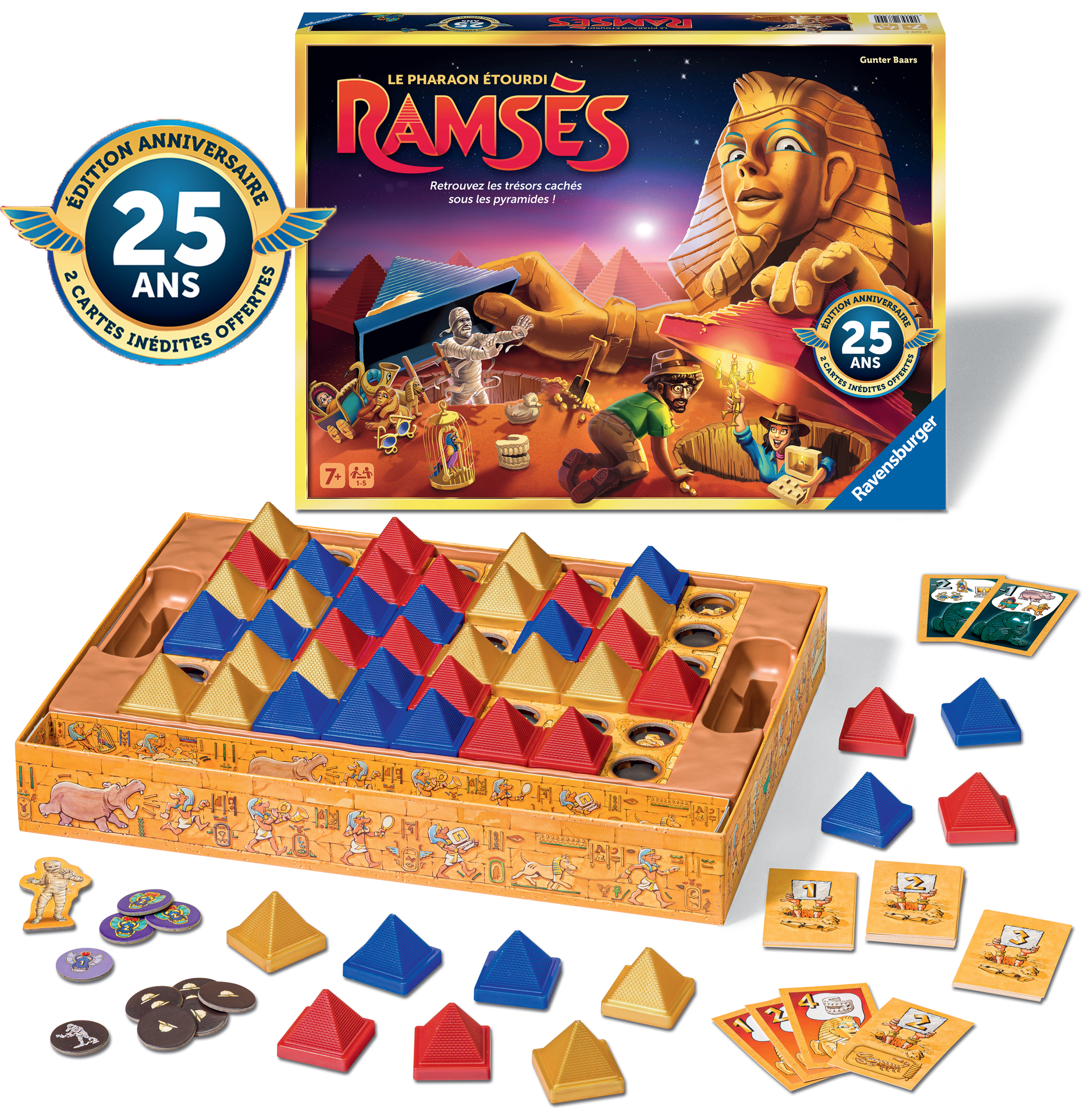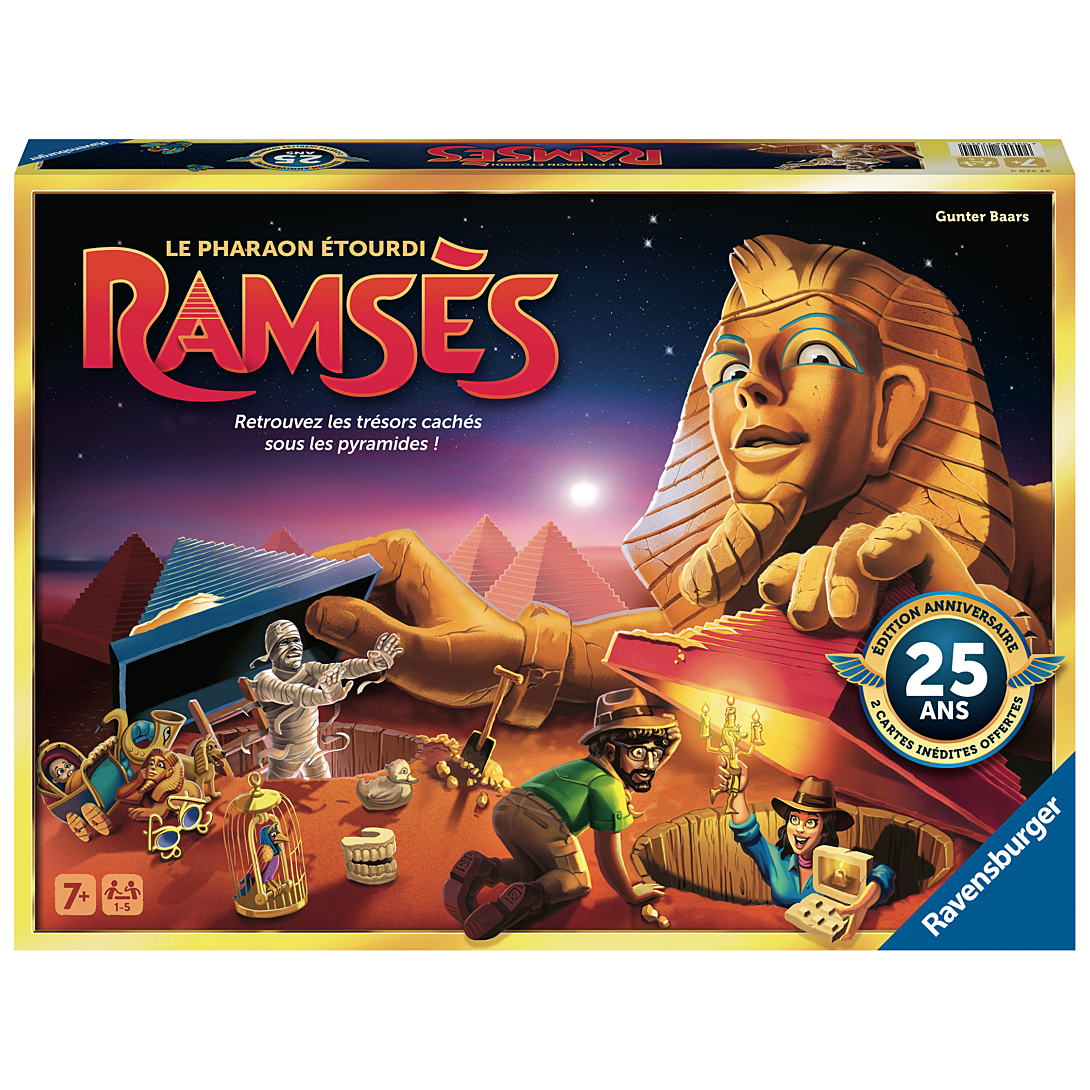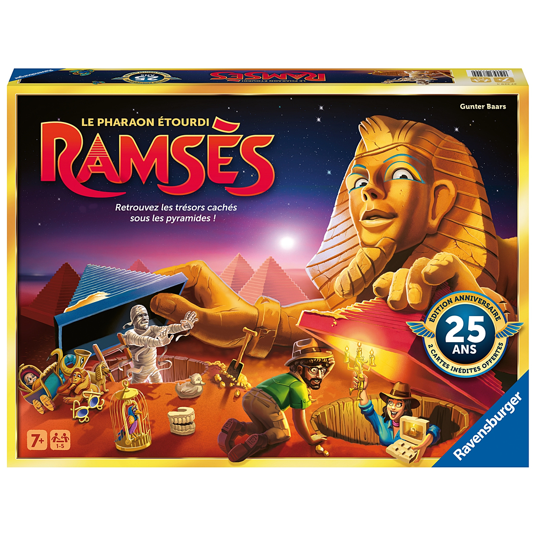 Plus produit UN GRAND CLASSIQUE DES JEUX FAMILLE ! Depuis 25 ans, Ramsès enthousiasme petits et grands et est devenu un incontournable des jeux de société pour toute la famille. Retrouvez la collecte aux trésors dans les pyramides égyptiennes dans une version anniversaire ! Qui saura récupérer tous ses trésors pour contenter le grand Ramsès ? ÉDITION LIMITÉE : Ramsès revient avec une nouvelle édition pour ses 25 ans. En exclusivité, 2 cartes inédites et une boîte à l\'effet métallisé ! Collectionneurs et collectionneuses de précieux trésors pharaoniques : rajoutez désormais Ramsès à votre trésor égyptien ! DES RÈGLES SIMPLES : Retournez votre carte Trésor, et poussez une pyramide sur l\'emplacement vide. Découvrez le trésor dessous et... Misère, ce n\'est pas le bon ! Au suivant de déplacer la pyramide jusqu\'à trouver son Trésor. Si vous découvrez le trésor de la carte, vous remportez le point ! Celui qui en a le plus à la fin de la partie a gagné ! DES PARTIES TOUJOURS DIFFERENTES : Jouez à l\'infini avec ce jeu dont les parties s\'enchaînent sans se lasser ! En solo ou à plusieurs, débutants ou avec la variante expert, changez toutes les pyramides de places et c\'est parti pour recommencer une partie totalement différente ! CONTENU : 47 pyramides de couleurs, des jetons pharaoniques, des cartes de trésors et c\'est parti ! Retrouvez également Ramsès dans sa version junior simplifiée à partir de 5 ans !