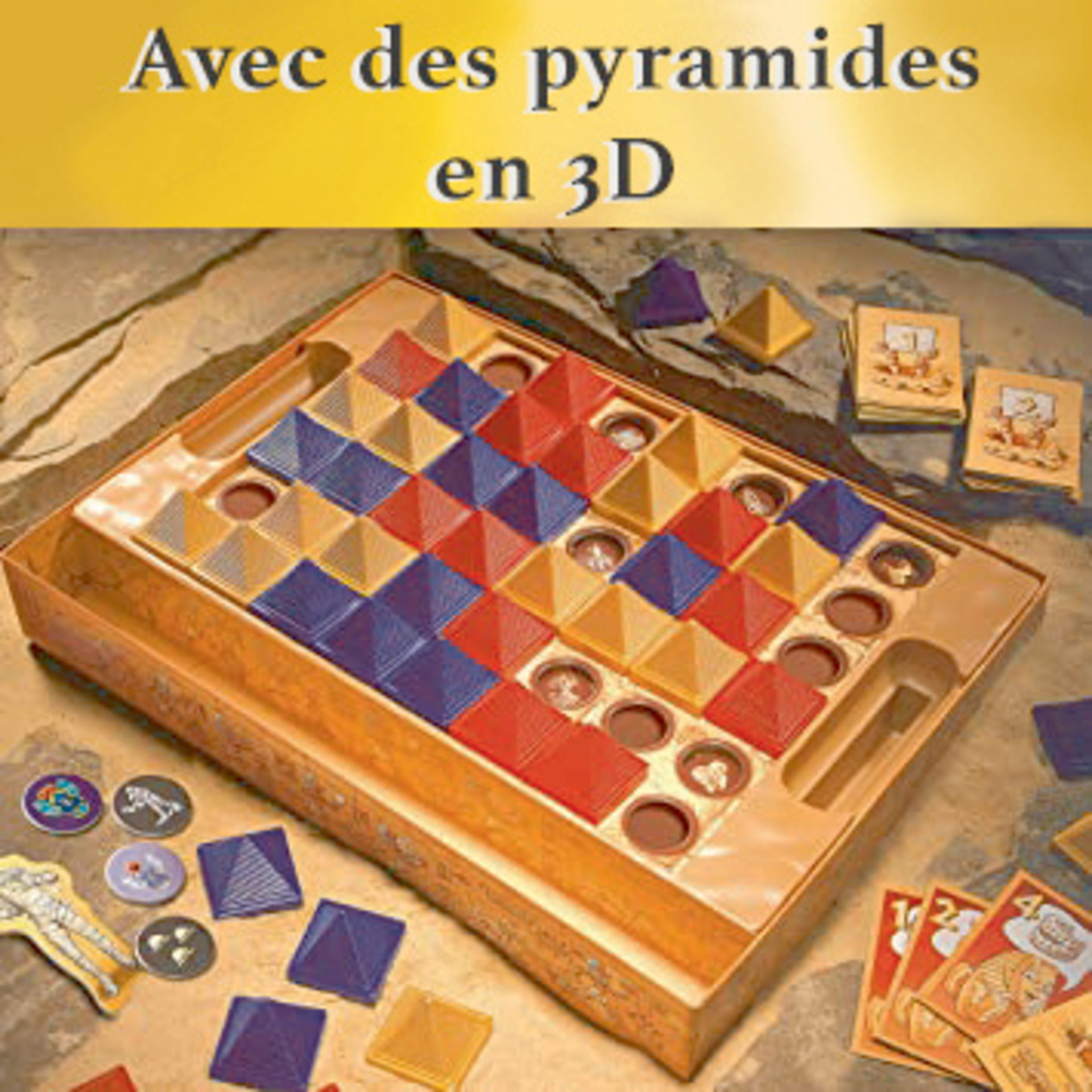 La boîte contient 47 pyramides en plastique, 48 jetons, 1 plateau de jeu, 30 cartes + 2 cartes inédites, 1 règle du jeu.