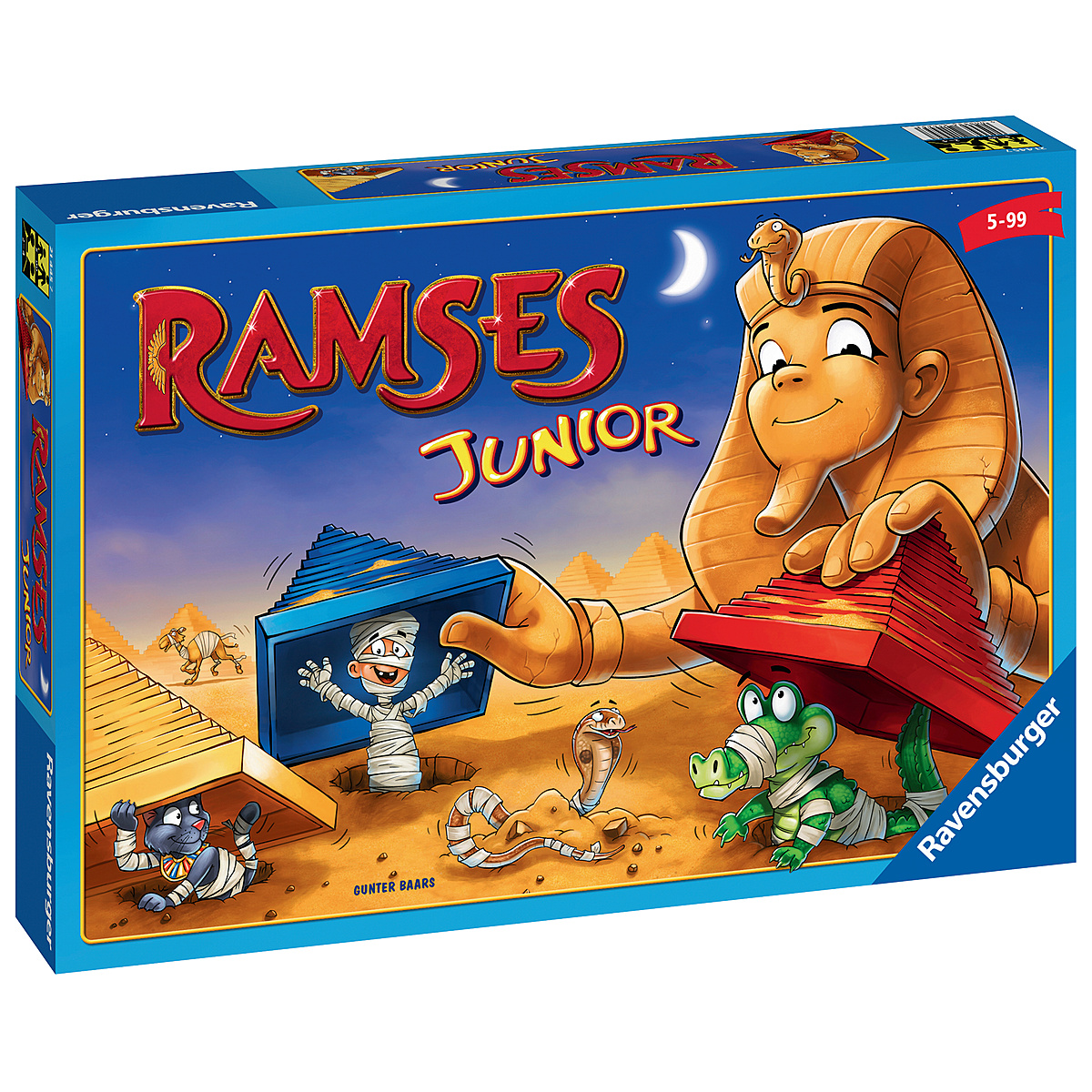 | Plus produit | UN GRAND CLASSIQUE DES JEUX FAMILLE ! Depuis 25 ans, Ramsès enthousiasme petits et grands et est devenu un incontournable des jeux de société pour toute la famille. Retrouvez la collecte aux trésors dans les pyramides égyptiennes dans une version junior ! Qui saura récupérer tous ses trésors pour contenter le grand Ramsès ? DES RÈGLES SIMPLES : Retournez votre carte Trésor, et poussez une pyramide sur l\'emplacement vide. Découvrez le trésor dessous et... Misère, ce n\'est pas le bon ! Au suivant de déplacer la pyramide jusqu\'à trouver son Trésor. Si vous découvrez le trésor de la carte, vous remportez le point ! Celui qui en a le plus à la fin de la partie a gagné ! MÉMOIRE & CHANCE : Un jeu familial qui fait appel à la mémoire, la concentration et à la chance ! Seul celui qui déplace habilement les pyramides sur le plateau de jeu, en souvenant du bon chemin, emporte la victoire. Celui qui trouve la momie reçoit une récompense supplémentaire du pharaon. PARTIES COURTES et DIFFÉRENTES : Jouez à l\'infini avec ce jeu dont les parties s\'enchaînent sans se lasser ! Deux modes de jeu pour des parties courtes et variées. Un plateau tournant pour modifier la place de la momie sous les pyramides et faire de chaque partie un moment unique. CONTENU : 35 pyramides de couleurs, 2 plateaux de jeu, 1 disque, 18 cartes Animal, 4 cartes Momie, 4 cartes Pharaon, 4 cartes Tempête de sable, 1 règle de jeu ! De 2 à 4 joueurs et à partir de 5 ans. Une partie dure en moyenne 15-20 minutes. Retrouvez également Ramsès dans sa version classique à partir de 7 ans ! |