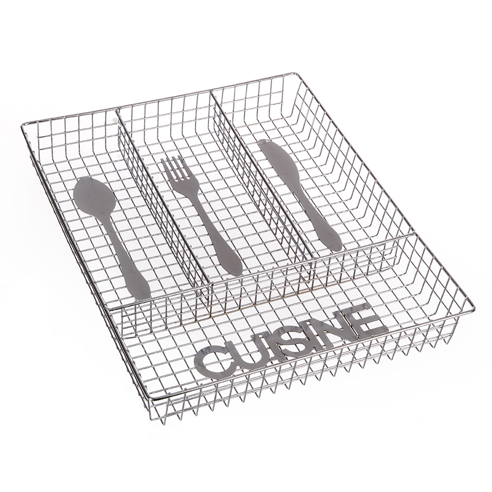 Doté d'un design à la fois moderne et sobre grâce à un quadrillage de fines barres métalliques chromées accompagné d'un lettrage << cuisine >>. Chacun de ses compartiments est accompagné d'un dessin représentant sa contenance (fourchette, couteau et cuillère).