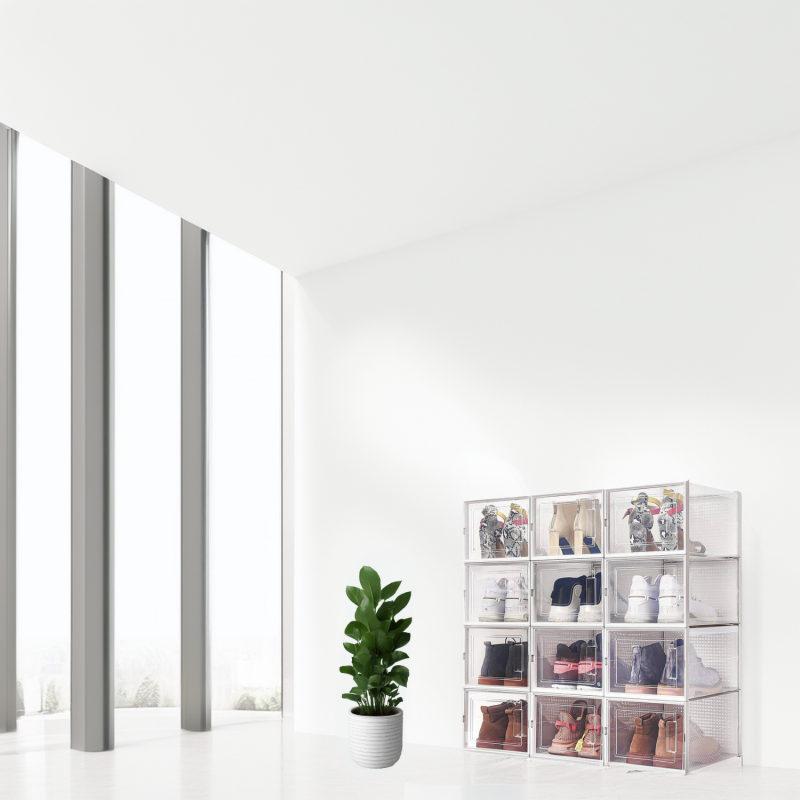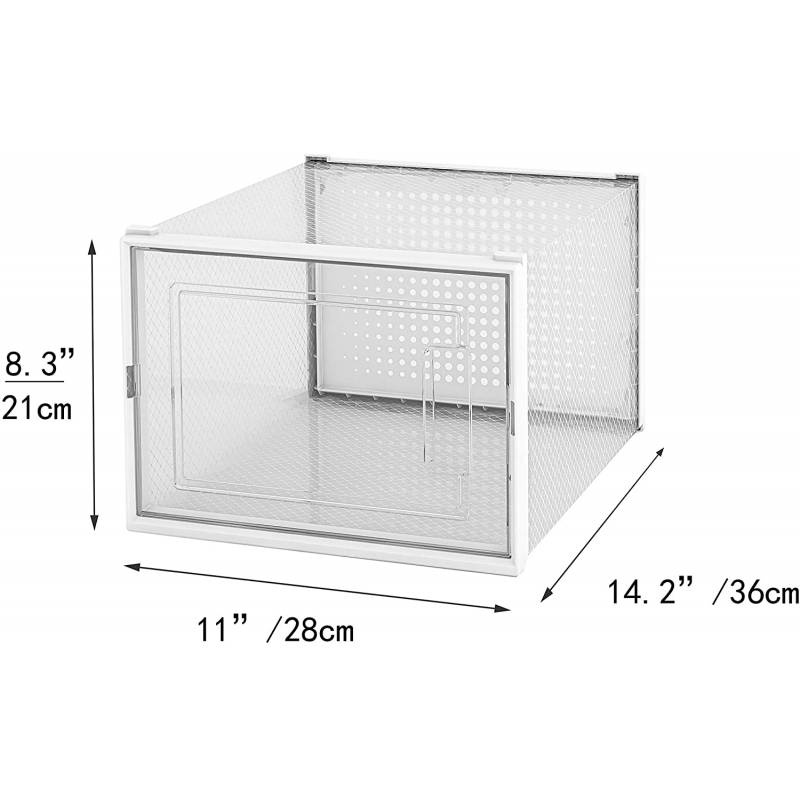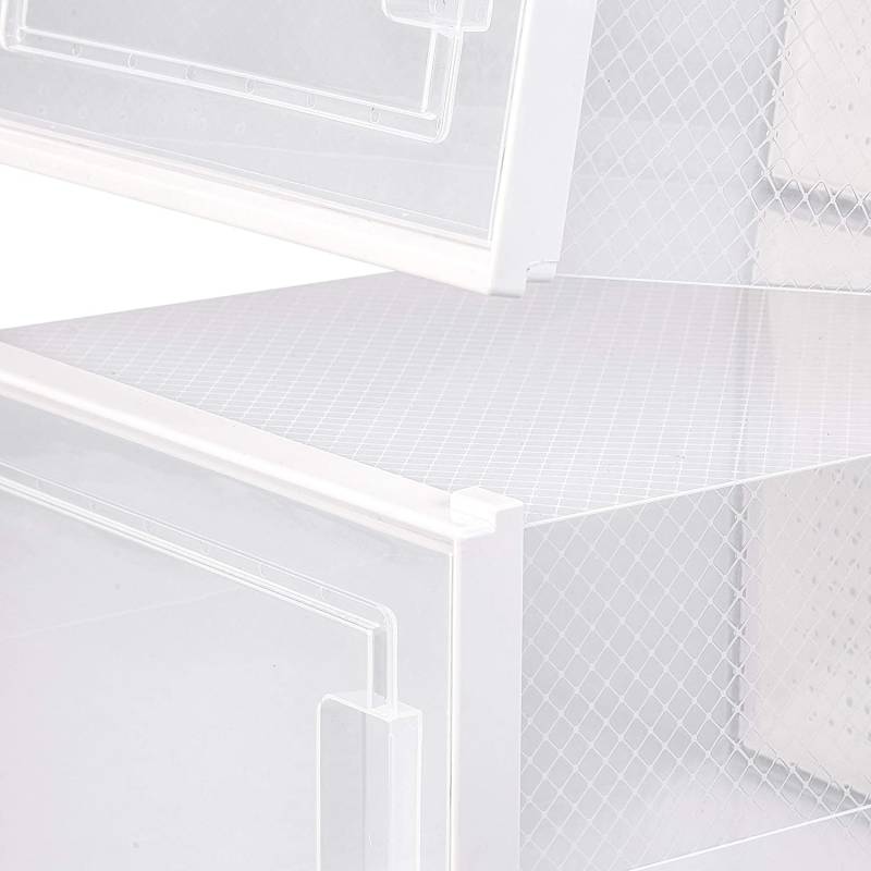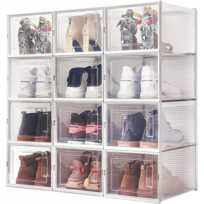 • Boîtes empilables : Au dos de la boîte de rangement, ce sont des panneaux en plastique PP dur avec trou, solide et sûr, pour assurer la circulation de l'air, faire respirer les chaussures et empêcher efficacement la poussière. Grâce au cran d'interconnexion sur les cadres, 12 boîtes à chaussures peuvent être solidement empilées pour gagner de la place et pour que vous puissiez les utiliser en toute sécurité.