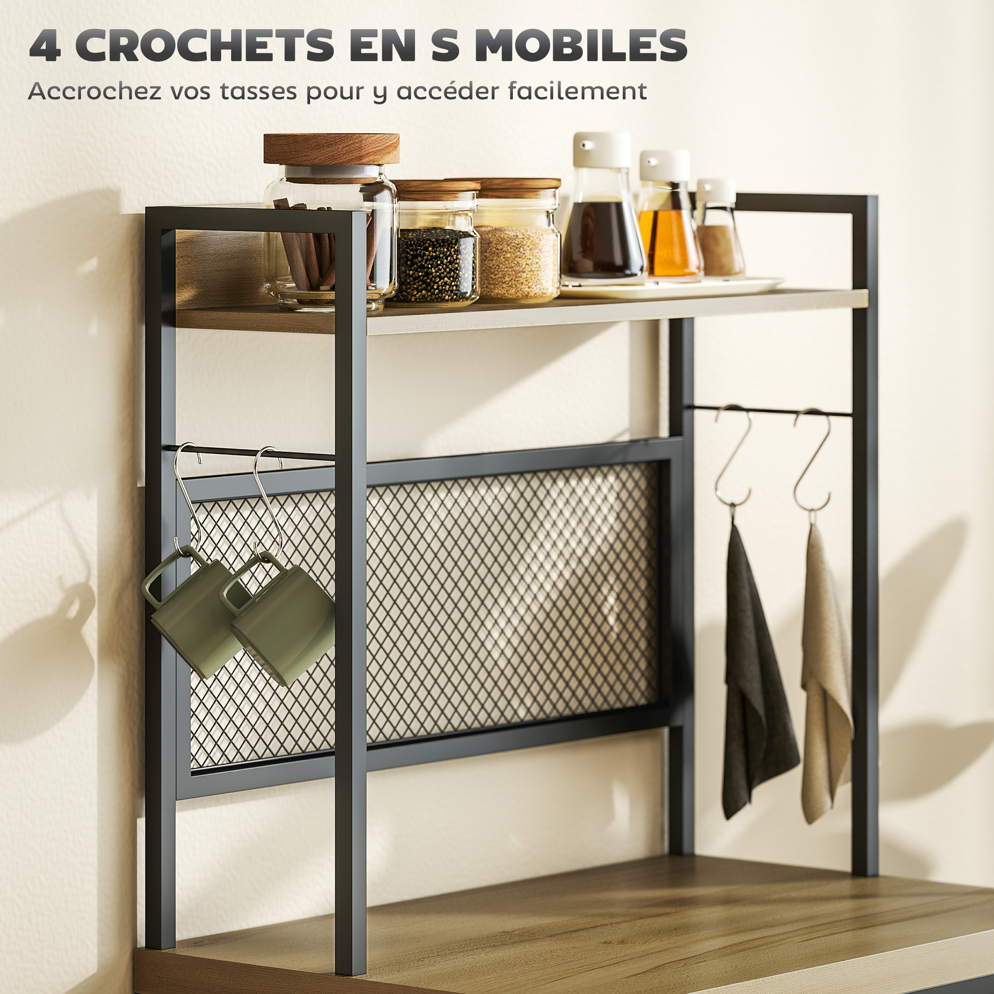 | Libellé | Rangement de cuisine - buffet style industriel 3 tiroirs, plan de travail, étagère, 4 crochets - métal effet bois noir clair |