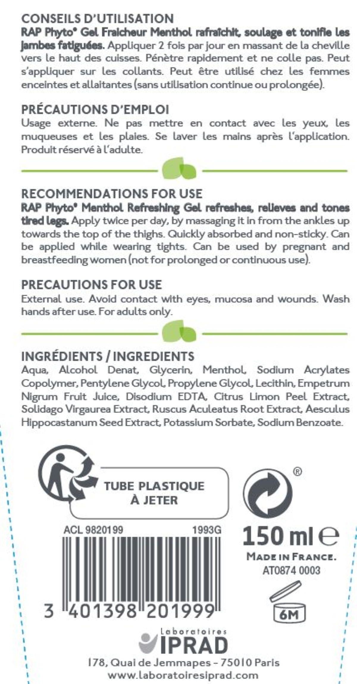 | Libellé | Rap Phyto gel fraîcheur jambes légères menthol 150ml |