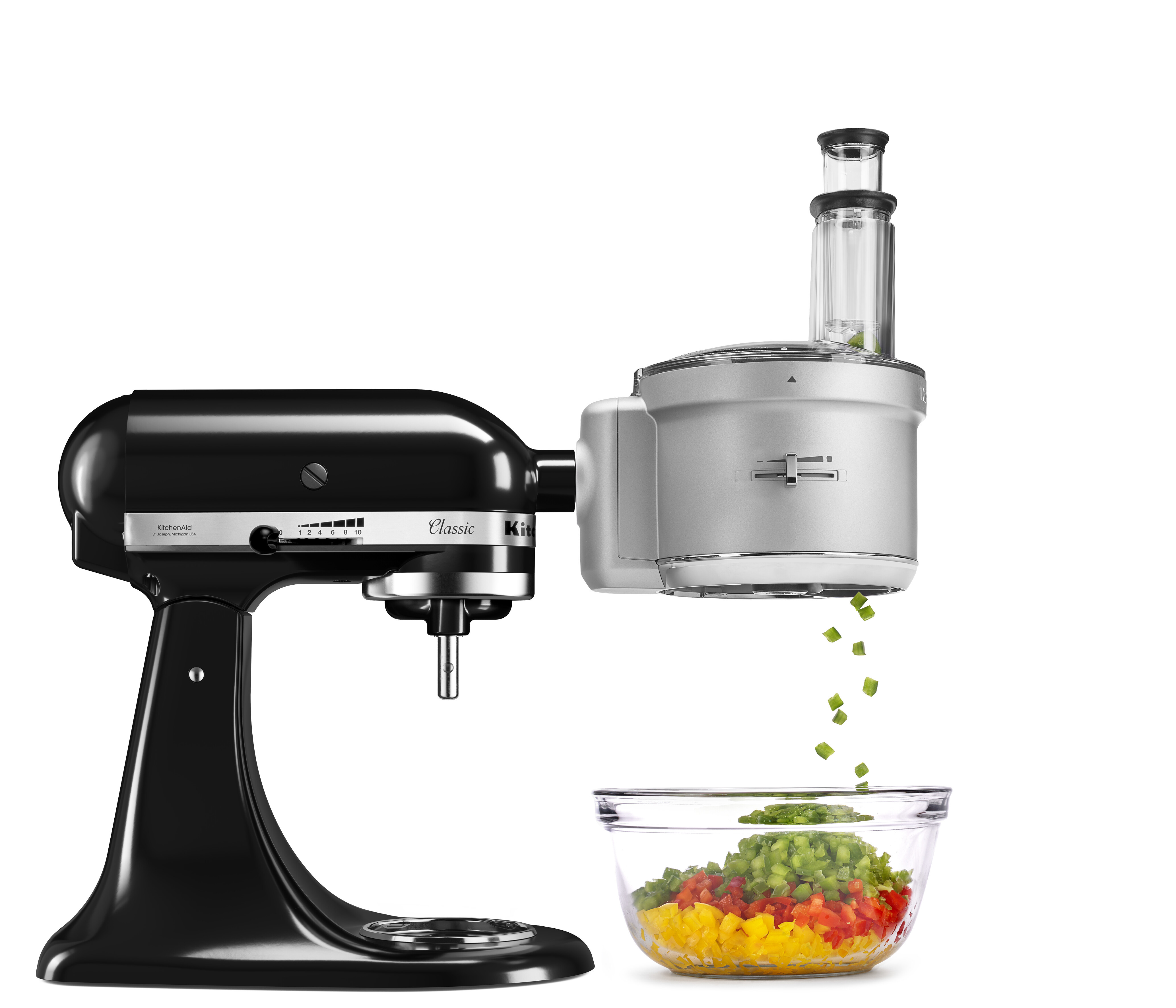 Robot multifonction pour tout type de robots pâtissiers KitchenAid; pour couper en rondelles, en dés, en lanières ou en julienne.