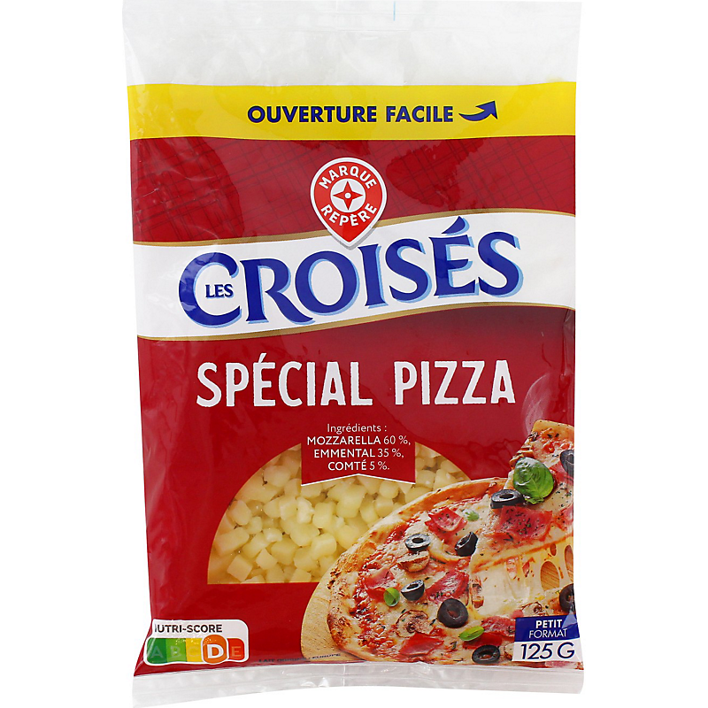 Ingrédients : Mozzarella 60 % (lait de vache pasteurisé, sel, ferments lactiques, coagulant microbien), Emmental 35 % (lait de vache pasteurisé, sel, ferments lactiques, coagulant microbien), Comté 5 % (lait cru de vache, sel, ferments lactiques, présure).