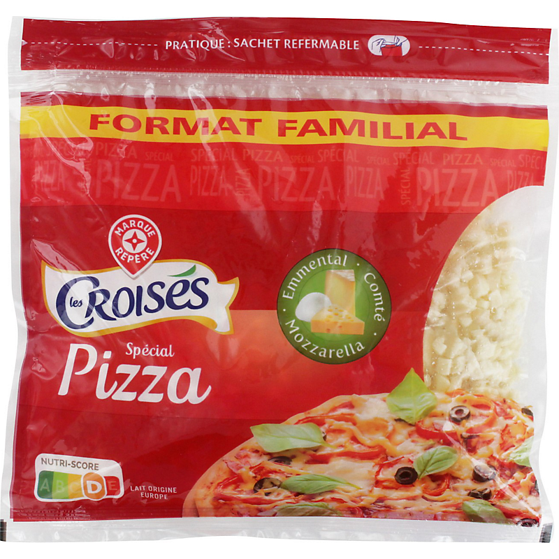 Ingrédients : Mozzarella 60 % (lait de vache pasteurisé, sel, ferments lactiques, coagulant microbien), Emmental 35 % (lait de vache pasteurisé, sel, ferments lactiques, coagulant microbien), Comté 5 % (lait cru de vache, sel, ferments lactiques, présure).