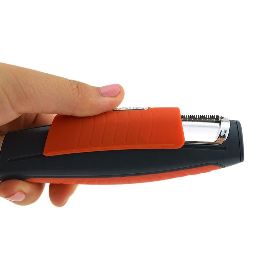 N'ayez plus peur de vous rater lors de votre rasage délicat, car il est équipé d'une mini lampe à LED intégrée dans le côté précis, pour éclairer les zones sombres. Vous ne manquerez alors aucun poil et pourrez aussi vous tondre les cheveux, sculpter la moustache, vous raser les poils du nez, des oreilles, les sourcils, la barbe et le corps. Son fonctionnement est très simple : il n'y qu'un seul bouton ON/OFF, et les sabots se clipsent sur leurs rasoirs respectifs. Pour utiliser les grands sabots il suffit de faire coulisser la partie orange.