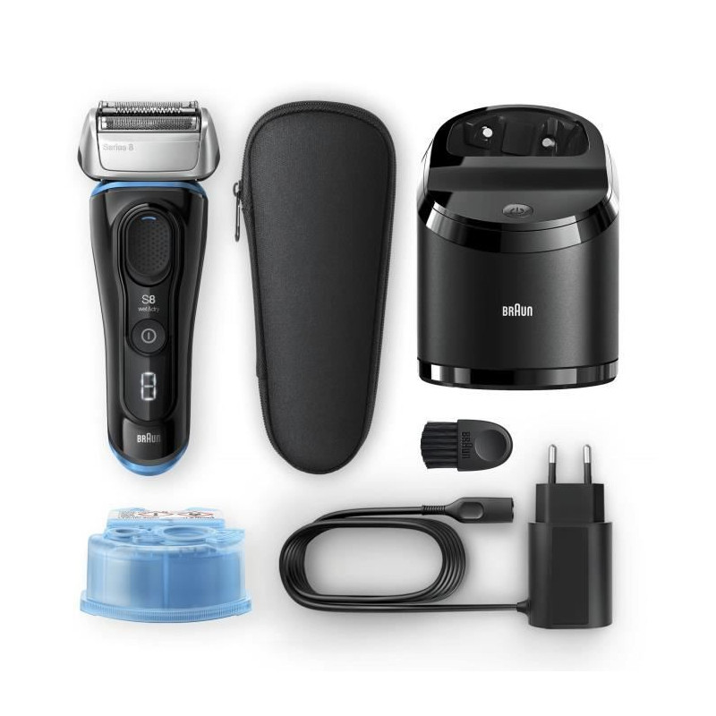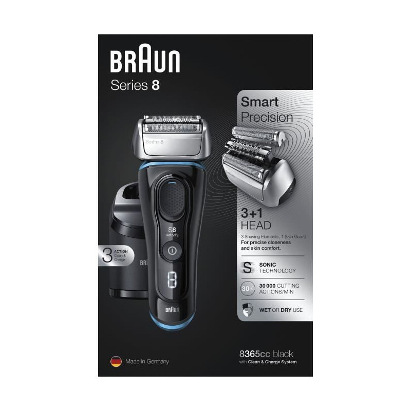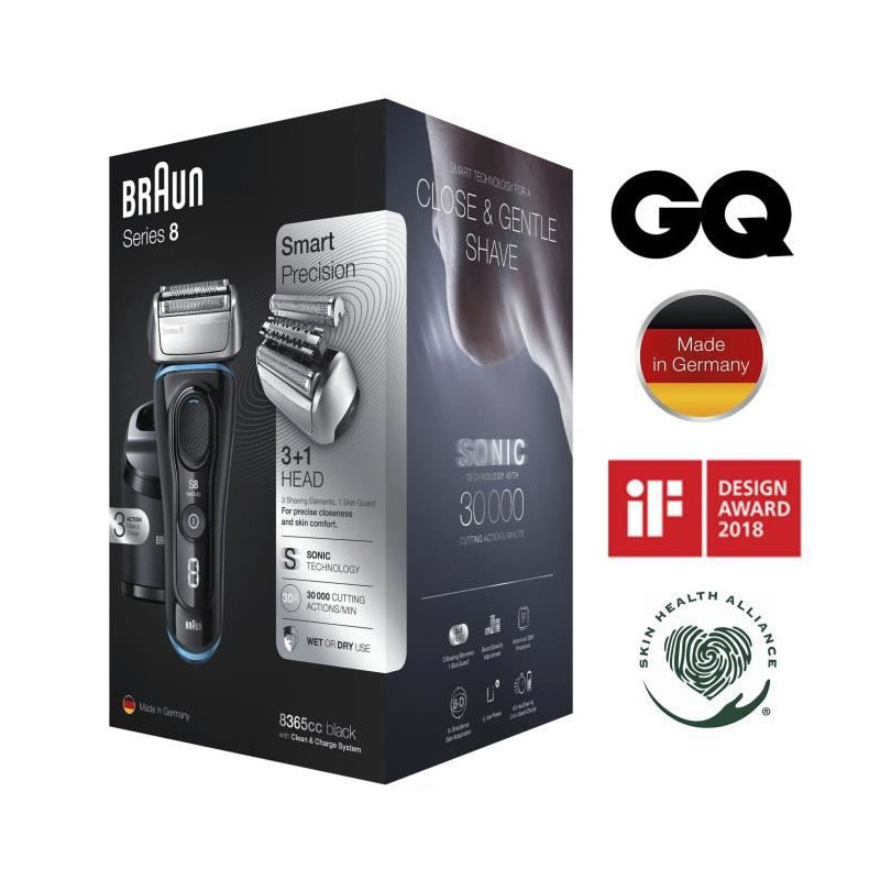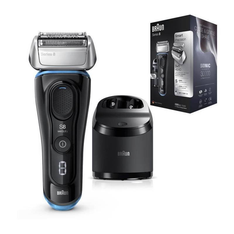 8-8365cc - rasoir électrique rechargeable étanche - Le rasoir électrique rechargeable étanche Series 8 Braun 8-8365CC offre confort pour la peau et rasage de près. La tête de précision capture les poils même dans les zones les plus difficiles, pour des résultats finaux impeccables. La technologie Sonic émet des micro-vibrations pour que la tête du rasoir électrique puisse glisser sur la peau pendant le rasage. Ce rasoir à grille convient au rasage avec ou sans eau. Avec 20 % de batterie en plus par rapport au rasoir barbe Series 7, et comprenant un affichage Pro avec tableau de bord de performance. Tous les rasoirs Series 8 sont fabriqués en Allemagne et conçus pour durer pendant 7 ans.Tondeuse Direct & Cut : Aligne et coupe les poils poussant dans différentes directions.2 grilles Opti-Foil : Pour un rasage de près parfait qui dure plus longtemps.Garde-Confort protecteur : Aligne et coupe les poils poussant dans différentes directions.Tondeuse de précision : Pour une taille parfaite de la moustache et des pattes.Technologie SynchroSonic : Les 10 000 micro vibrations à chaque passage aident à capturer les poils.Technologie Auto-senseur intelligente : Analyse la densité de la barbe et adapte la puissance du rasoir 13 fois par seconde.Tête flexible 8 directions : Pour une adaptabilité maximale.Puce 32 bit : Moteur puissant pour un expérience de rasage incomparable.Wet & Dry : 100% étanche, avec une utilisation sur peau humide ou peau sèche, avec ou sans mousse à raser.5 min charge rapide :Permet de recharger le rasoir en 5 min assurer un rasage complet.Autonomie 60 min :La batterie fournit une puissance continue, avec une charge complète en 1h.Affichage 5 LED :Toutes les informations pour l?entretien de votre rasoir en un clin d??il.Surface anti-dérapante :Pour un maniement en toute sécurité.Pochette de voyage :Pour transporter votre rasoir partout.Station Clean & Charge 3 actions :Pour un rasoir frais et propre à chaque utilisation. - Type de produit : Rasoir électrique rechargeable.