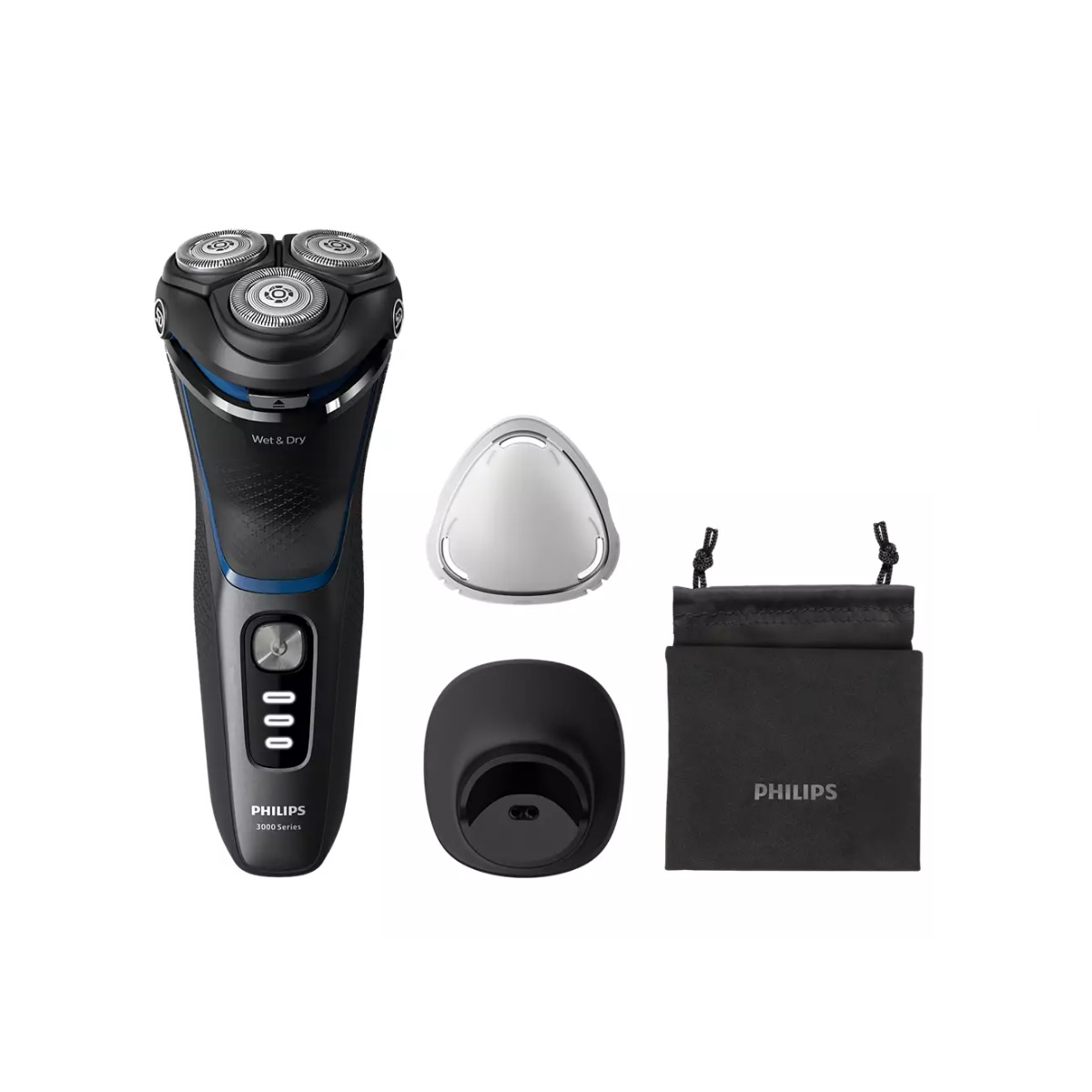 S3344-13 - rasoir électrique rechargeable - Grâce au rasoir électrique S3344/13 de Philips, obtenez un rasage net et confortable, même sur peau sensible. Les têtes 5D Pivot & Flex, les 27 lames PowerCut auto-affûtées et l’utilisation sur peau sèche ou humide assurent des résultats excellents et fiables à chaque rasage. Flexible, la tête pivote dans cinq directions et suit ainsi toutes les courbes de votre visage, coupant juste au-dessus du niveau de la peau pour un rasage net et confortable, même sur les peaux sensibles. En seulement une heure, la batterie Li-ion durable est complètement chargée pour environ 20 rasages. Vous êtes pressé ? Une charge rapide de 5 minutes suffit pour un rasage. La tête de rasage s’ouvre d’une simple pression sur un bouton pour vous permettre de la rincer à l’eau courante. Les 27 lames auto-affûtées coupent chaque poil au-dessus du niveau de la peau de manière uniforme pour un résultat lisse et régulier à chaque fois. Nos lames auto-affûtées restent comme neuves pendant 2 ans. Nos lames de rasoir sont fabriquées en acier hypoallergénique de qualité chirurgicale pour résister à la corrosion, éviter les impuretés et protéger votre peau. Gardez toujours une bonne prise en main. Le manche ergonomique en caoutchouc assure une prise en main sûre et confortable, même lorsqu’il est humide. Optez pour un rasage pratique sur peau sèche ou utilisez votre mousse ou gel préféré pour un rasage rafraîchissant sur peau humide, même sous la douche. Affinez et définissez votre moustache et vos pattes avec la tondeuse rétractable pour peaufiner votre look. Ne soyez jamais à court de batterie. L’indicateur d’autonomie vous indique si la batterie est faible, déchargée ou en charge. Gardez votre rasoir chargé et bien rangé grâce au socle de charge pratique.