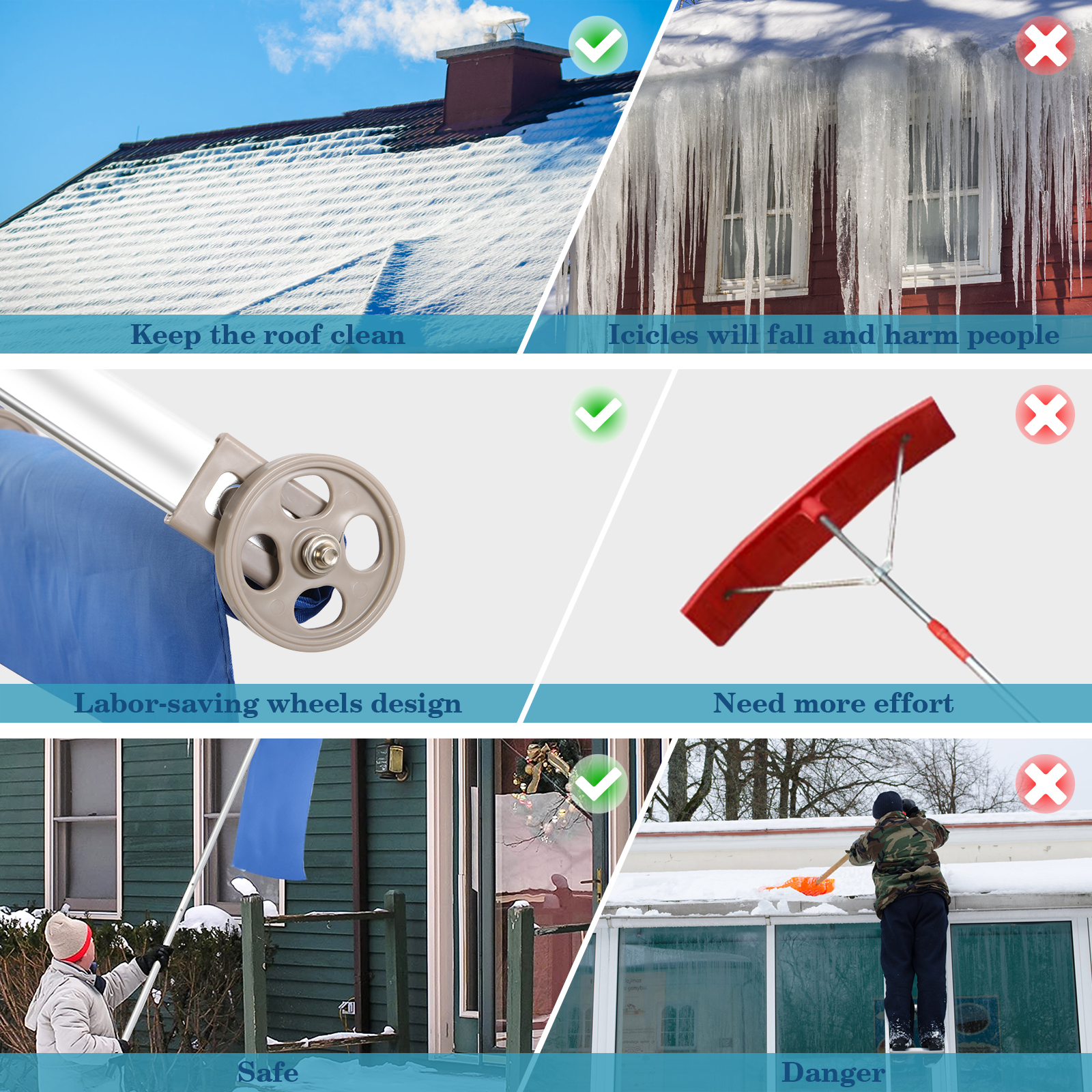 - Conception de roues économisant du travail : l'outil de déneigement de toit équipé de deux roues garantit que votre toit ne sera pas endommagé lors de l'utilisation. La poignée ergonomique antidérapante réduira les efforts que le rateau typique.