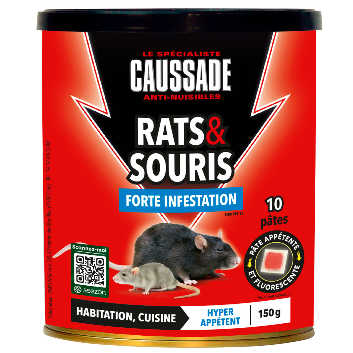 Les rongeurs ont envahi votre habitation, entrepôt, cuisine et vous avez des dégâts, signes d'une forte infestation. Caussade vous propose une pâte dotée d'une grande appétence pour attirer et éliminer l'ensemble de la colonie.Forte infestation• 1 seule ingestion suffit• Idéal pour lieux secs et/ou humides tels qu'habitation, entrepôt, cuisine• Curatif• Souris : 30 à 50 g, soit 2 à 3 sachets d'appât par station d'appât.• Rats : 60 à 80 g, soit 4 à 5 sachets d'appât par station d'appât.• AMM FR N° 2023-0012. Composition : Brodifacoum 0,0017 % m/m (CAS N°56073-10-0). Utilisez les produits biocides avec précaution. Avant toute utilisation, lisez l'étiquette et les informations sur le produit