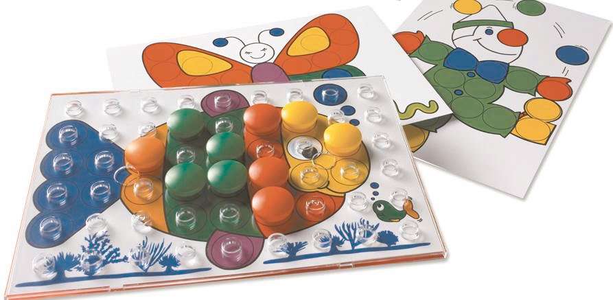 Toucher, manipuler, construire et déconstruire permet aux petits de mieux s'approprier les tailles, les formes et les couleurs. Avec ce jeu incontournable, les enfants jouent à compléter des silhouettes amusantes avec de gros pions colorés et faciles à fixer, sur un grand support transparent. Les 6 fiches recto-verso leur offrent la possibilité de suivre le modèle, ou de créer des combinaisons de couleur en toute liberté.;Les 40 pions extra larges et aux couleurs variées (bleu, jaune, rouge, vert, orange et violet) offrent aux petites mains un confort de jeu optimal, et donne aux enfants l'envie de jouer, encore et encore ! Ce jeu favorise ainsi le développement de la motricité fine, l'apprentissage des 6 couleurs de base et la créativité. Dès 2 ans.;Ce produit est composé de matériaux issus de forêts bien gérées certifiées FSC®, de matériaux recyclés et de matériaux issus d’autres sources contrôlées (FSC-C111262).