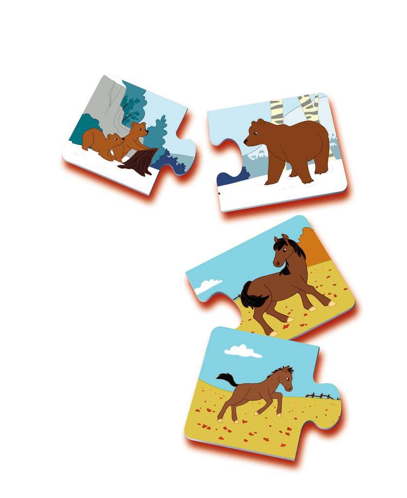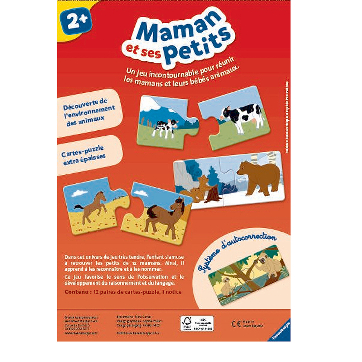 Les enfants sont particulièrement fascinés par les animaux. Le jeu "Maman et ses petits" leur propose de découvrir les animaux dans leur environnement et d'apprendre leur nom. Dans cet univers de jeu très tendre, il faut retrouver les petits de 12 mamans. Grâce aux pièces de puzzle autocorrectives, l'enfant joue à réunir les familles en toute simplicité et peut vérifier lui-même s'il a correctement associé les images.;Les cartes extra épaisses lui offrent un confort de jeu optimal pour jouer et rejouer, encore et encore ! Ce jeu favorise ainsi le sens de l'observation, le développement du langage, du vocabulaire lié aux animaux, et de la motricité fine. Dès 2 ans.;Ce produit est composé de matériaux issus de forêts bien gérées certifiées FSC®, de matériaux recyclés et de matériaux issus d’autres sources contrôlées (FSC-C111262).