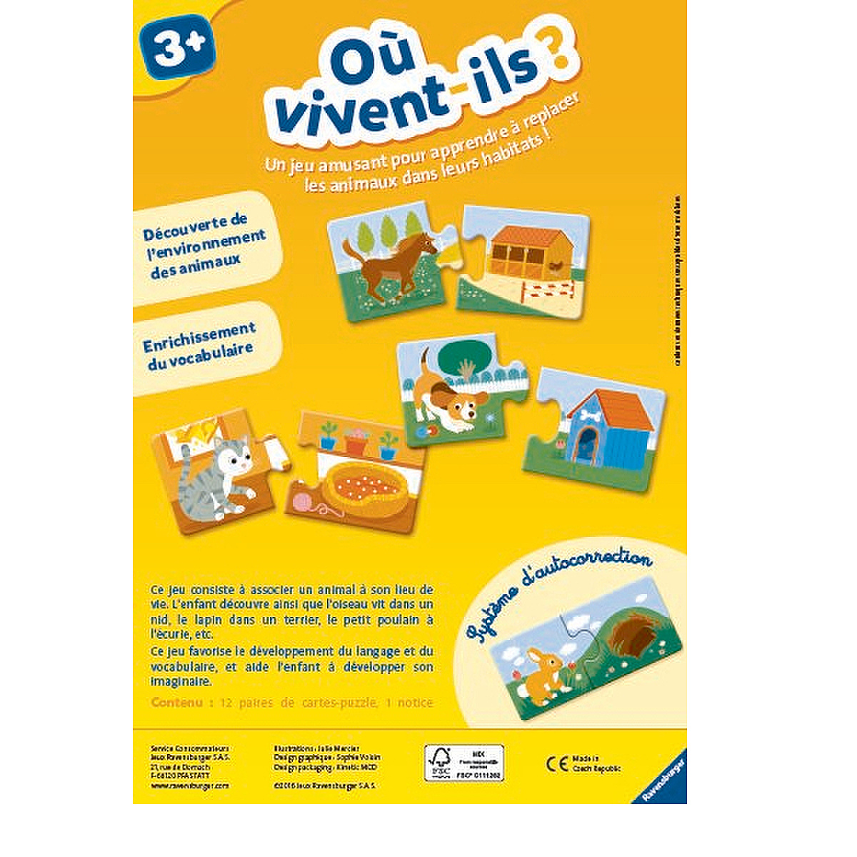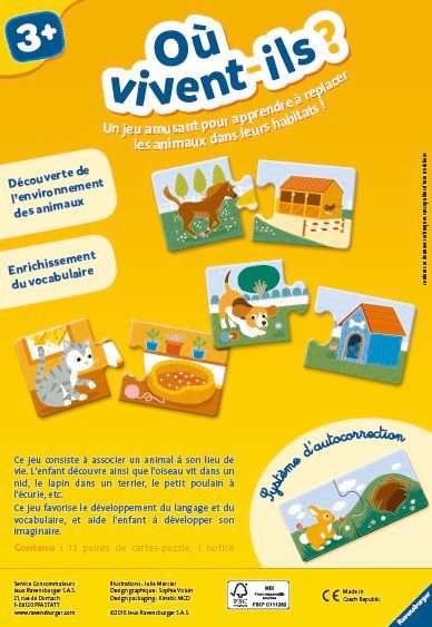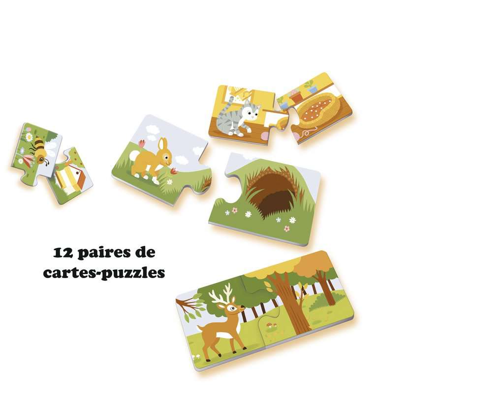 | Plus produit | Un jeu amusant pour apprendre à positionner les animaux dans leurs habitats ! A l\'aide des cartes-puzzles l\'enfant joue à associer un habitat à un animal. Des images modernes et des animaux mignons. L\'environnement des animaux n\'aura plus de secret ! Les enfants découvrent lenvironnement des animaux et apprennent la relation qui les lie à leur habitat. Cette approche va favoriser le développement du langage, du vocabulaire lié aux animaux et donc un appui au développement de l\'imaginaire de l\'enfant. Les enfants apprendront à associer limage dun animal à celle de son lieu de vie. Les enfants découvrent ainsi que loiseau vit dans un nid, le lapin dans un terrier, le petit poulain à lécurie, etc. Les pièces de puzzles auto-correctives permettent de vérifier si les 12 paires dillustrations sont correctement associées. Contenu: 12 paires de cartes-puzzles (animal / habitat) et 1 notice. Ce produit est composé de matériaux issus de forêts bien gérées certifiées FSC®, de matériaux recyclés et de matériaux issus dautres sources contrôlées (FSC-C111262). Produit imaginé en France et fabriqué en Europe. " Ce coffret s\'accompagne d\'une collection entière pour les enfants dès 3 ans. Le coffret Qui mange quoi ou le coffret 1,2,3 pour apprendre les nombres. Retrouver pour chaque âge de 2 à 5 ans une multitude de jeux basés sur les notions essentielles et sur des connaissances à acquérir." |