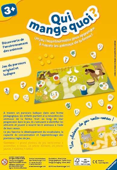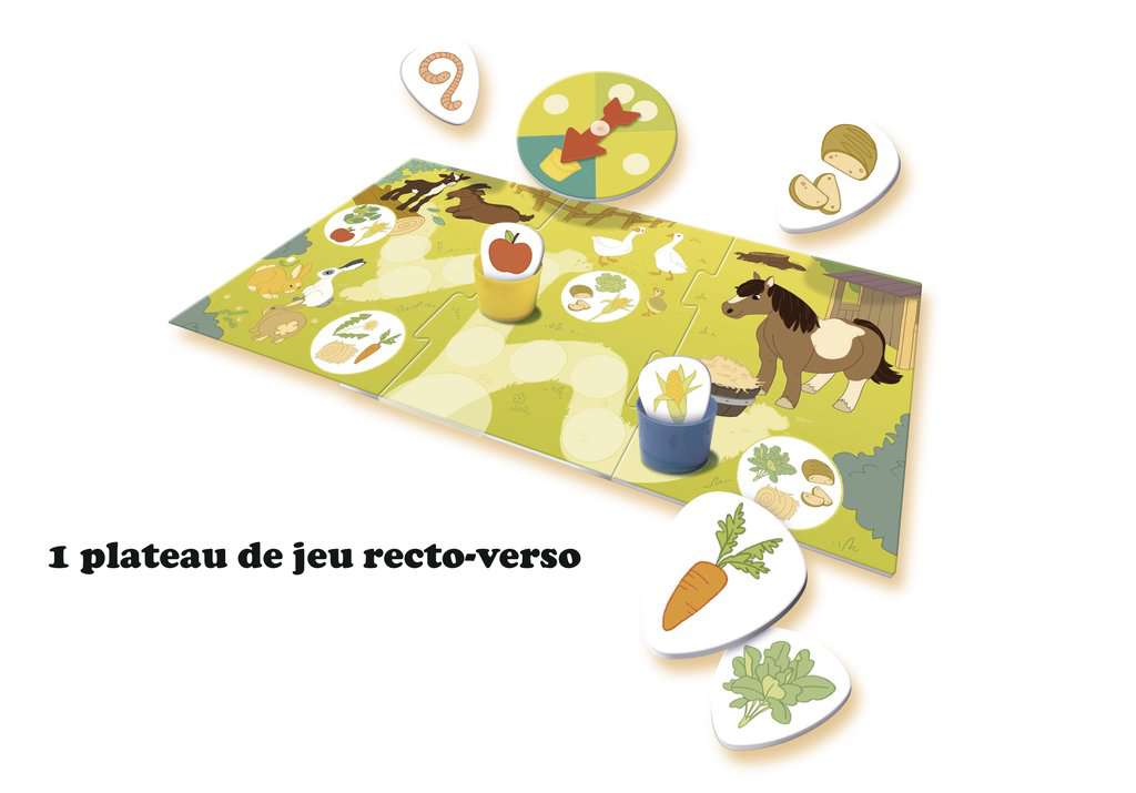 | La boîte contient | 1 grand plateau de jeu recto-verso à assembler, 4 seaux, 24 jetons-aliments, 24 jetons jaunes, 1 roulette, 1 notice |