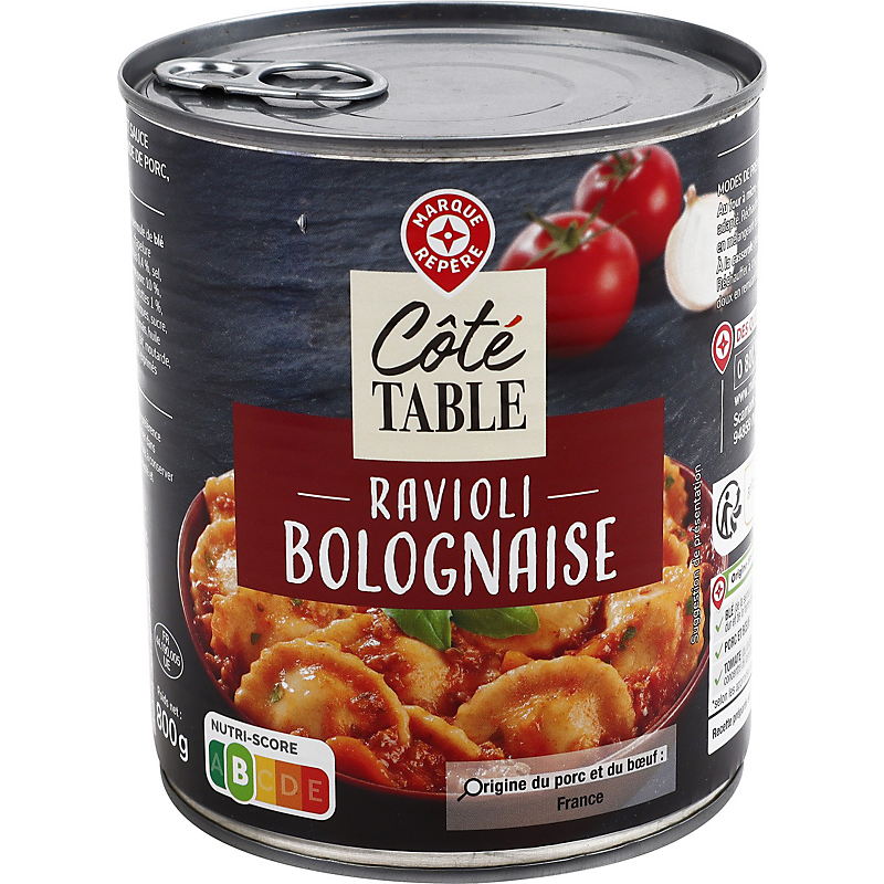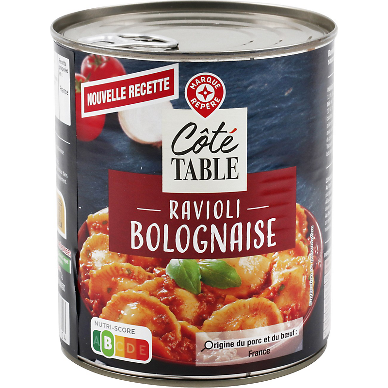 Ingrédients : Eau, ravioli 27 % (semoule de blé dur 11 %, eau, viande de bœuf 5 %, chapelure [farine de blé, sel, levure], carottes, sel, oignons), viande de porc 10 %, triple concentré de tomates 6,5 %, vin blanc, carottes 1 %, oignons 1 %, sucre, huile de colza, sel, persil, ail en poudre, arôme naturel, arôme naturel d'origan avec autres arômes naturels, amidon de maïs, arôme naturel de poivre.