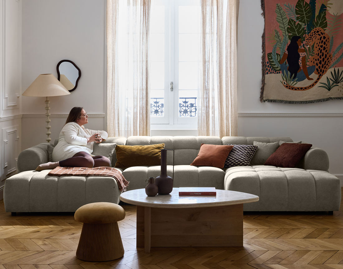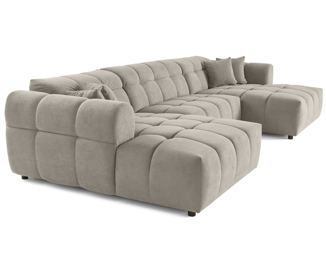 Le Ray - canapé panoramique en U 7 places en tissu texturé est l’incarnation du confort et du style. Sa assise généreusement rebondie est spécialement conçue pour offrir un confort optimal et durable, vous permettant de profiter de moments de détente prolongés. L’assise bombée, douce comme un nuage, vous enveloppe agréablement, apportant une sensation de légèreté à chaque utilisation. Le dossier incurvé, quant à lui, assure un soutien parfait et une posture idéale, transformant votre salon en un véritable espace de relaxation.