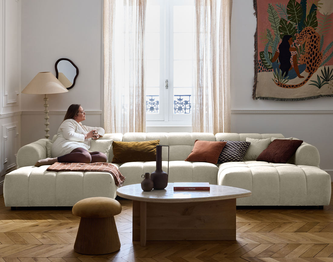 Le Ray - canapé panoramique en U 7 places en tissu texturé est l’incarnation du confort et du style. Sa assise généreusement rebondie est spécialement conçue pour offrir un confort optimal et durable, vous permettant de profiter de moments de détente prolongés. L’assise bombée, douce comme un nuage, vous enveloppe agréablement, apportant une sensation de légèreté à chaque utilisation. Le dossier incurvé, quant à lui, assure un soutien parfait et une posture idéale, transformant votre salon en un véritable espace de relaxation.