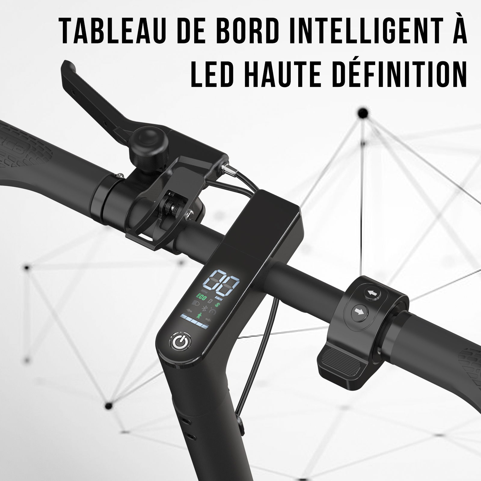 【Ecran LED et feux arrière de haute qualité】- L'écran LED adopte un affichage semi-transparent, une haute luminosité, un style unique, montrant pleinement la texture du scooter électrique. Pendant la conduite, vous pouvez clairement comprendre la vitesse de la trottinette, le niveau de la batterie, la connectivité Bluetooth et d'autres données. En même temps, le scooter électrique est équipé de feux arrière LED pour assurer la sécurité de la conduite de nuit.