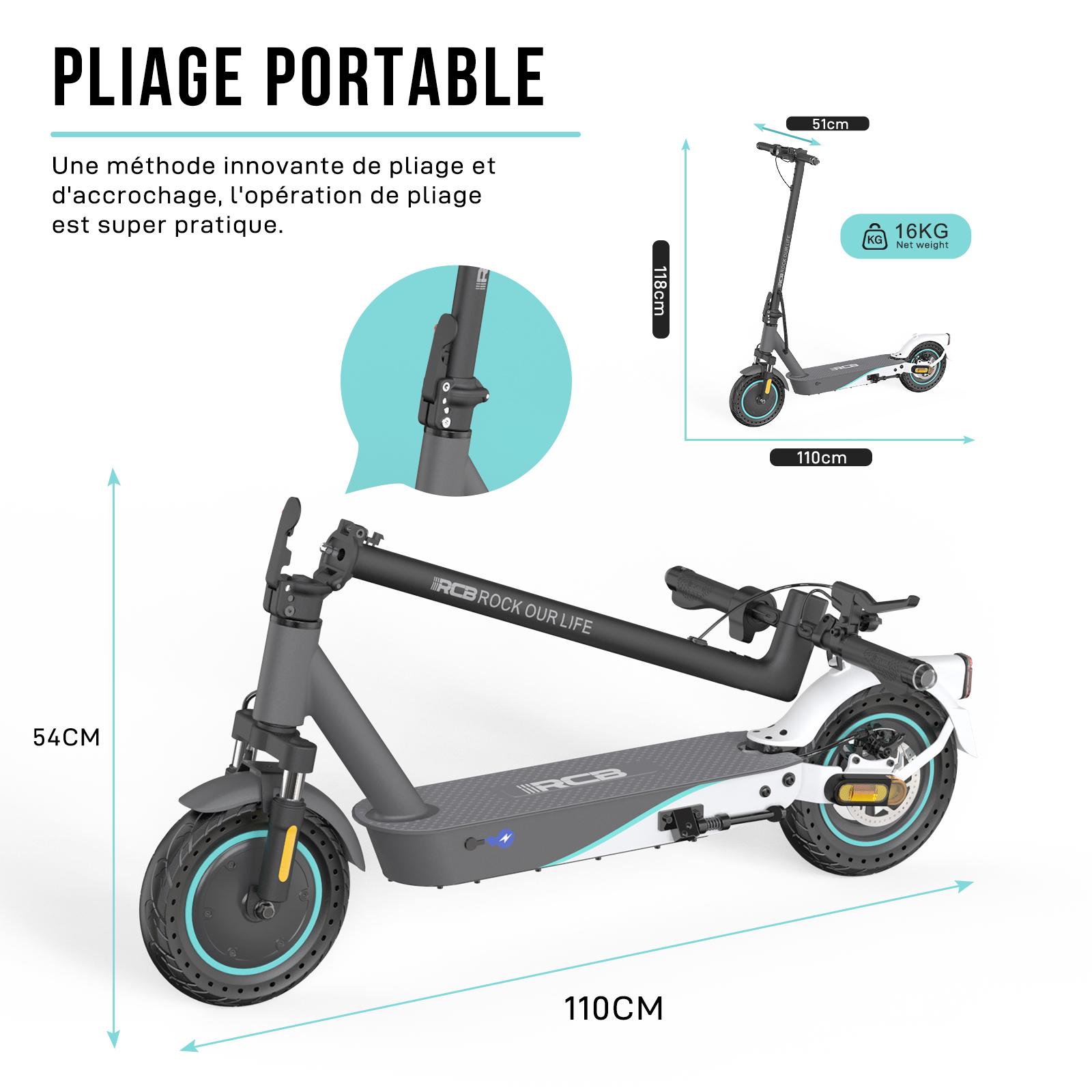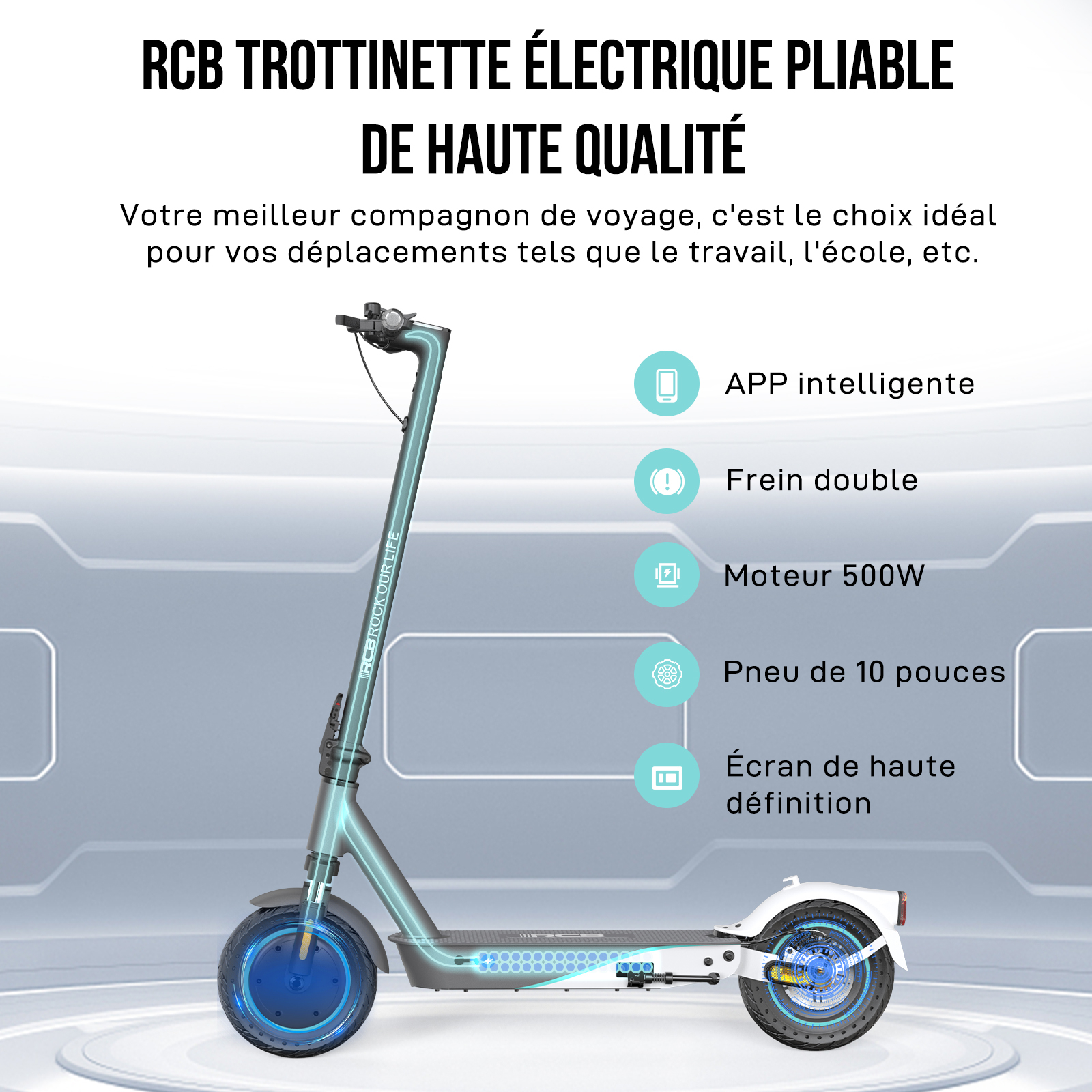 RCB Trottinette électrique pliable 10 pouces, Frein double, poids léger de 16 kg , moteur 500W avec APP, 3 modes de vitesse jusqu'à 25KM/H pour les adultes et les juniors, scooter électrique de haute qualité avec puissante batterie 36V 11.4 Ah , idéal pour les déplacements urbains