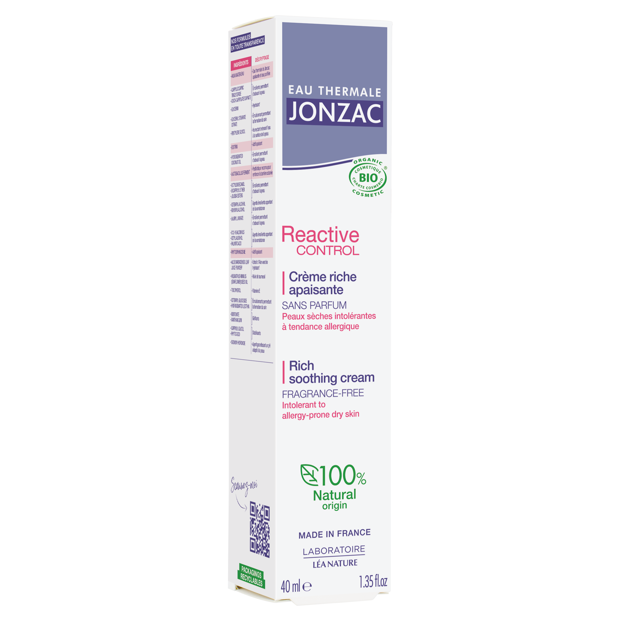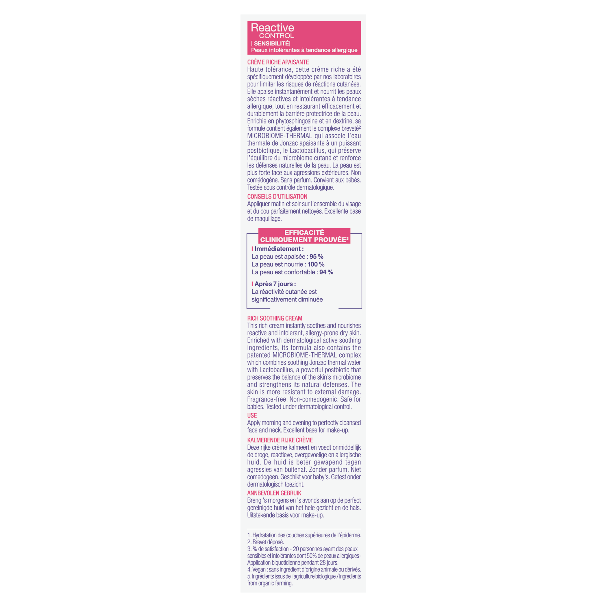 REACTIVE [ SENSIBILITÉ ] Peaux intolérantes, à tendance allergique Haute tolérance, cette crème riche a été spécifiquement développée par nos laboratoires pour limiter les risques de réactions cutanées. Elle apaise instantanément et nourrit les peaux sèches réactives et intolérantes à tendance allergique, tout MICROBIOME-THERMAL qui associe l'eau thermale de Jonzac apaisante à un puissant postbiotique, le Lactobacillus, qui préserve l'équilibre du microbiome cutané et renforce les défenses naturelles de la peau. La peau est plus forte face aux agressions extérieures. Non comédogène. Sans parfum. Convient aux bébés. Testée sous contrôle dermatologique.