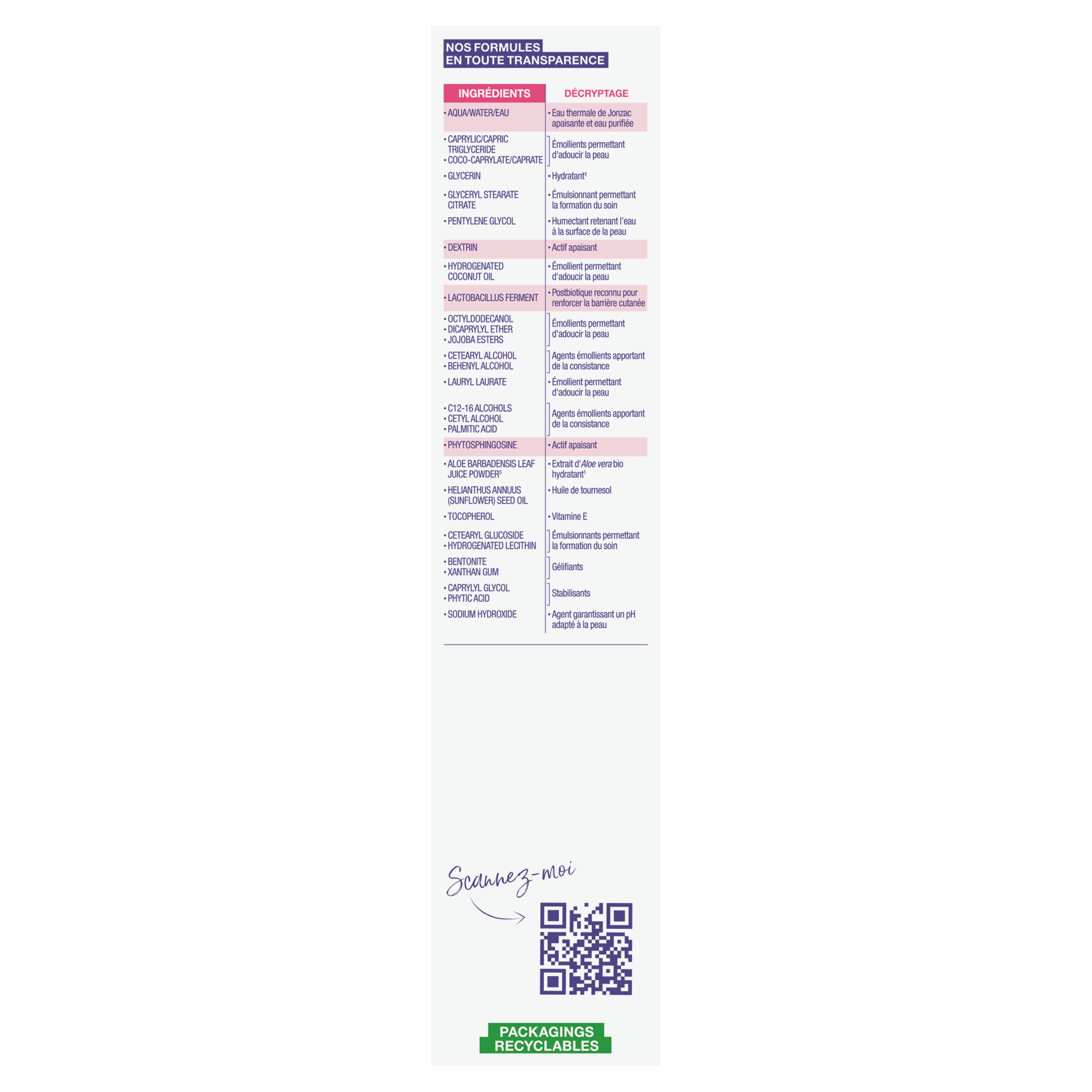 Ingrédients : aqua/water/eau, caprylic/capric triglyceride, coco-caprylate/caprate, glycerin, glyceryl stearate citrate, pentylene glycol, dextrin, hydrogenated coconut oil, lactobacillus ferment, octyldodecanol, dicaprylyl ether, jojoba esters, cetearyl alcohol, behenyl alcohol, lauryl laurate, c12-16 alcohols, cetyl alcohol, palmitic acid, phytosphingosine, aloe barbadensis leaf juice powder[5], helianthus annuus (sunflower) seed oil, tocopherol, cetearyl glucoside, hydrogenated lecithin, bentonite, xanthan gum, caprylyl glycol, phytic acid, sodium hydroxide
