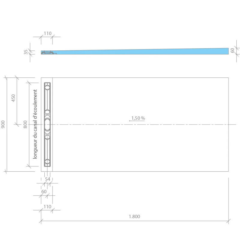 Re découpable : 30 cm maximum de part et d'autre du canal d'écoulement