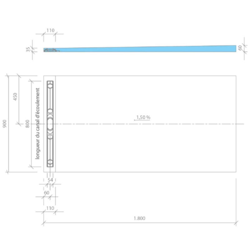 Re découpable : 30 cm maximum de part et d'autre du canal d'écoulement
