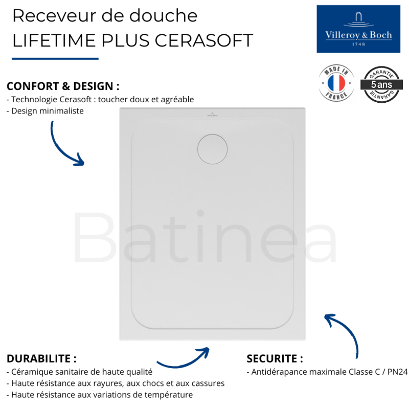 | Libellé | Receveur de douche antidérapant 100 x 80 VILLEROY ET BOCH Lifetime Plus Cerasoft céramique blanc + Bonde blanc |