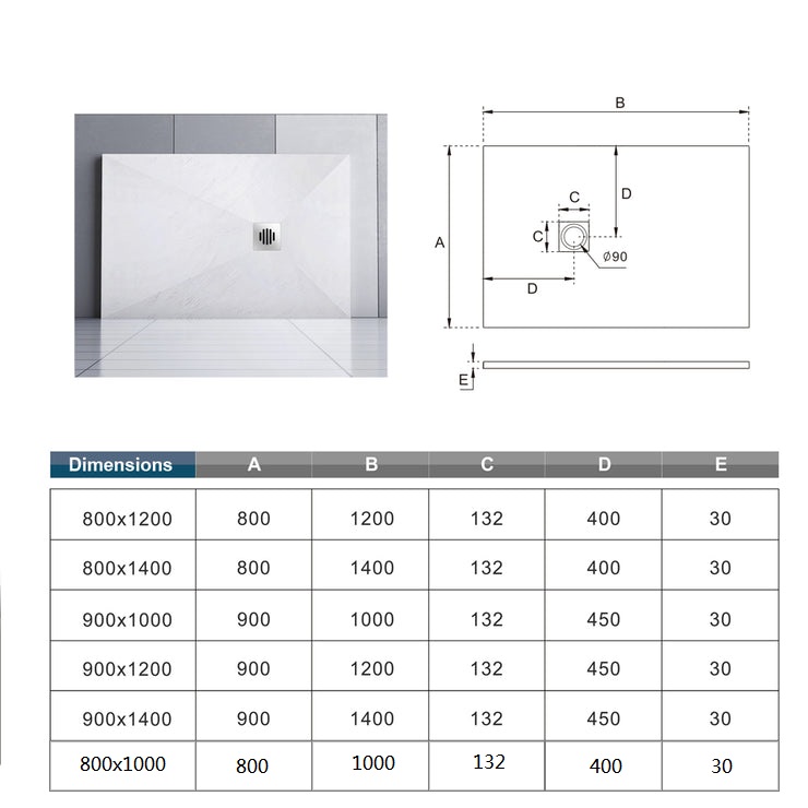 ● Finition aspect ardoisé anti-dérapantet très esthétique, L'installation du receveur de douche se fait très facilement et il n'est pas nécessaire de révolutionner la zone de douche car l'intérieur du receveur dispose d'un bac de récupération incliné qui facilite l'écoulement de l'eau et la transporte vers le drain positionné à l'extrémité supérieure, afin de permettre un maximum d'espace libre sans l'accumulation minimale d'eau