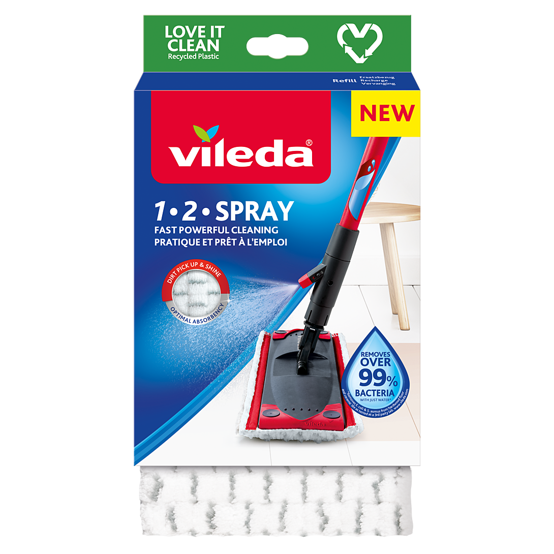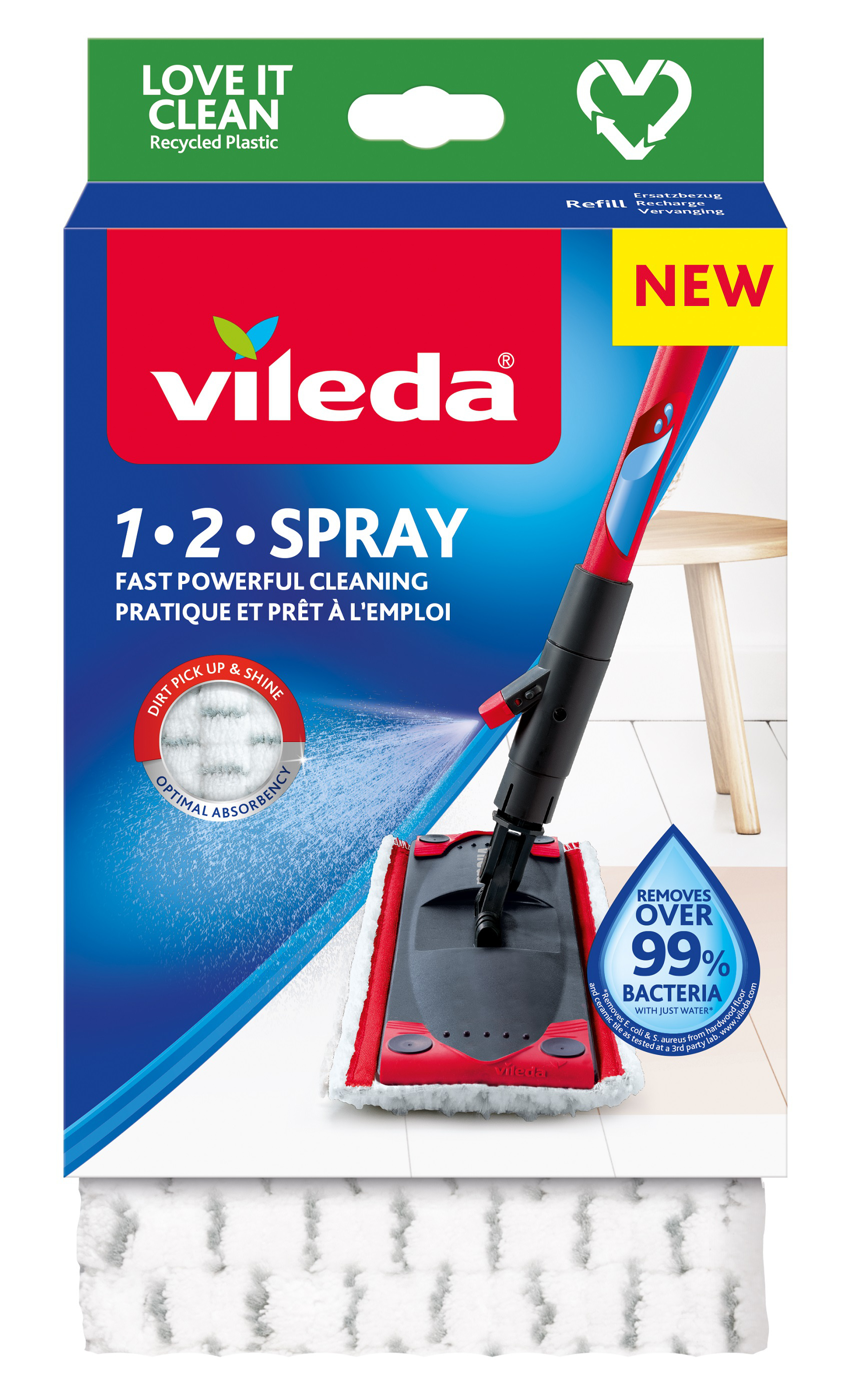 La recharge de balai vaporisateur UltraMax et 1,2 de Vileda nettoie même la saleté la plus tenace avec moins d'effort, grâce au tampon en microfibre 2 en 1 incorporant des fibres blanches pour garantir une excellente performance de nettoyage avec des fibres rouges et grises pour enlever la saleté tenace. Meilleure évacuation de l'eau et ramassage des déversements par rapport à la précédente recharge UltraMax de Vileda. Le coussinet est facilement attachable et détachable à la fois au balai vaporisateur Vileda UltraMax et 1,2 en utilisant les boutons pression faciles à 4 boutons et peut être lavé en machine jusqu'à 60 °C.