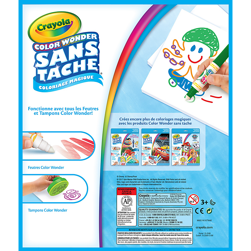 | Avertissements | ATTENTION! Ne convient pas aux enfants de moins de 36 mois: contient de petits éléments pouvant entraîner un danger d’étouffement en cas d’ingestion. POUR DE MEILLEURS RESULTATS: Les produits Color Wonder contiennent un colorant incolore, invisible sur la plupart des surfaces ménagères. Après utilisation, se laver les mains à l’eau et au savon pour enlever tout résidu. CONSEILS POUR LES TACHES : Les produits Color Wonder peuvent albérer l’apparence de certaines surfaces. Afin de minimiser ce risque, essuyer immédiatement les surfaces ménagères qui ont été en contact avec les produits Color Wonder Éviter tout contact avec le papier peint, les murs peints, le bois traité et non traité, le vinyle, le cuir et toute autre matière non lavable. Ne pas exposer les dessins terminés directement sur des surfaces poreuses telles que les appareils électroménagers, les plans de travail, les murs et les placards. |